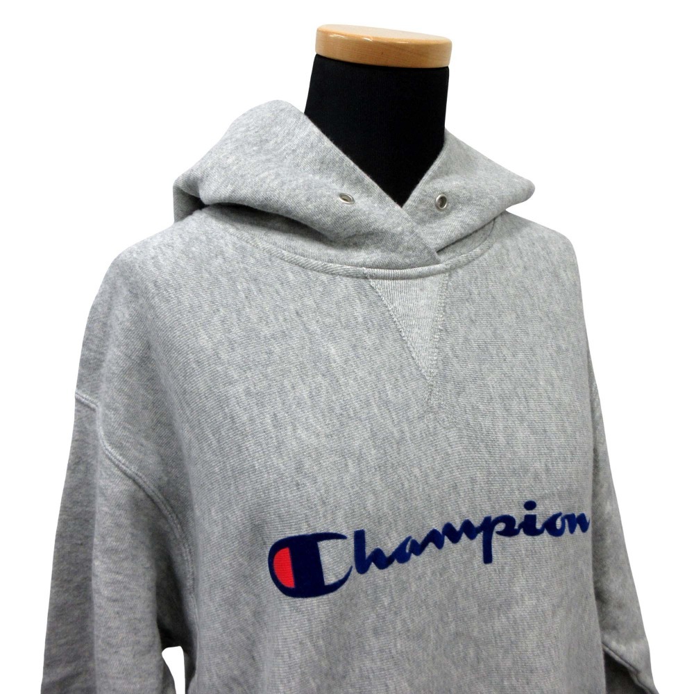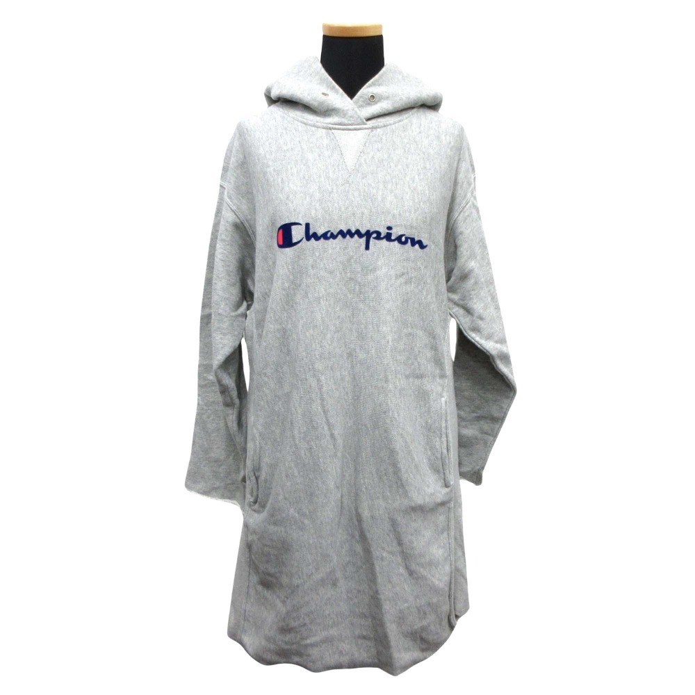 美品 CHAMPION チャンピオン スウェット ロング ワンピース パーカー チュニック カットオフ プルオーバー ロゴ フーディー M グレー