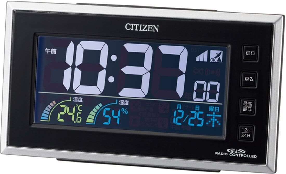 ☆★シチズン リズムクロック デジタル電波目覚まし時計 8RZ121-002 パルデジットネオン121 生産終了品☆★おしゃれなカラー液晶のデジタル電波目覚まし時計です。AC電源式で常時光り続けます。◇メーカー希望小売価格9,350円(税込)◇●多機能表示電波目覚まし時計●角度調整機能付●電子音アラーム●スヌーズ機能付●12時間/24時間表示切換式●カレンダー表示機能付(2099年12月31日まで表示可能)●温度表示機能付(‐9.9~50℃)●湿度表示機能付(20~95%)●注意報表示(食中毒・カビ・ダニ・インフルエンザ・熱中症)●最高・最低温湿度表示(25時間以内の最高/最低の温度・湿度)●ACアダプター付●LEDバックライト●材質:プラスチック枠●配色:黒●サイズ/重さ:78×138×45mm/182g(ACアダプター含まず)※新品未使用品※取扱説明書付※メーカー保証書1年付