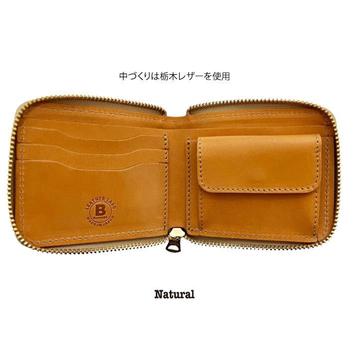 ■表面に新喜皮革社オイルコードバン(グレージング加工)、中作りを栃レザー社オイルレザーと贅沢な革の使用をしたラウンドファスナー二つ折り財布です。