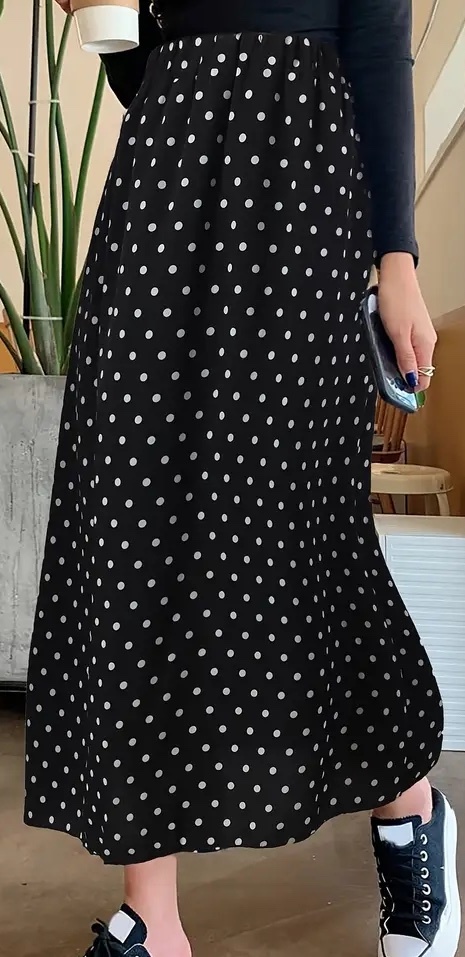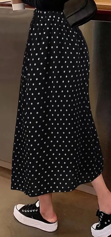 ポルカドット ロングスカート 春秋 ノンストレッチ ブラック XLサイズ (2418)
