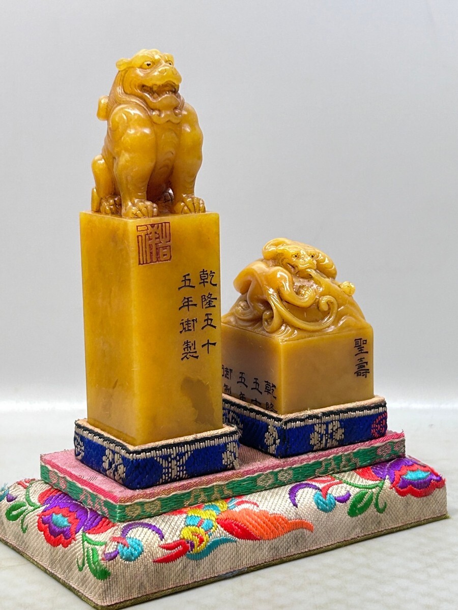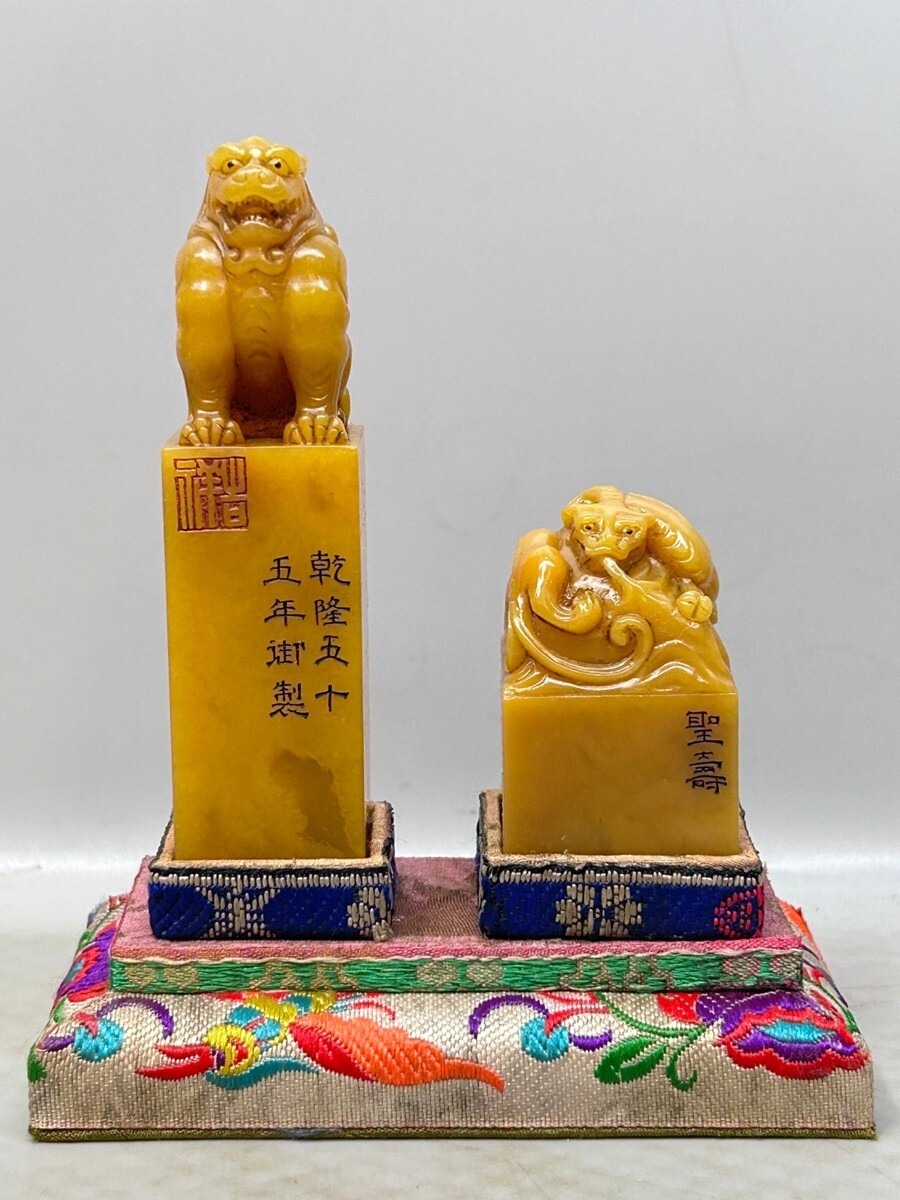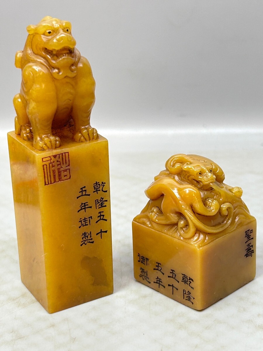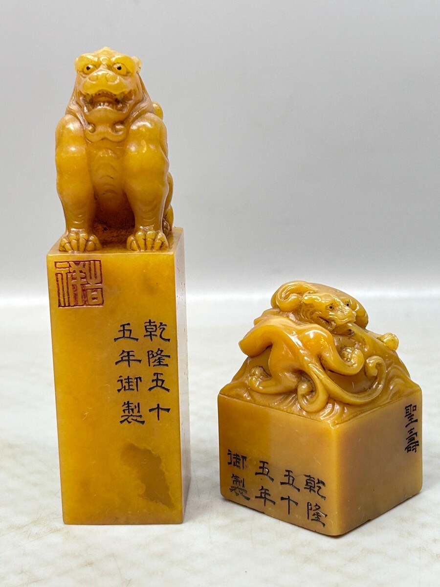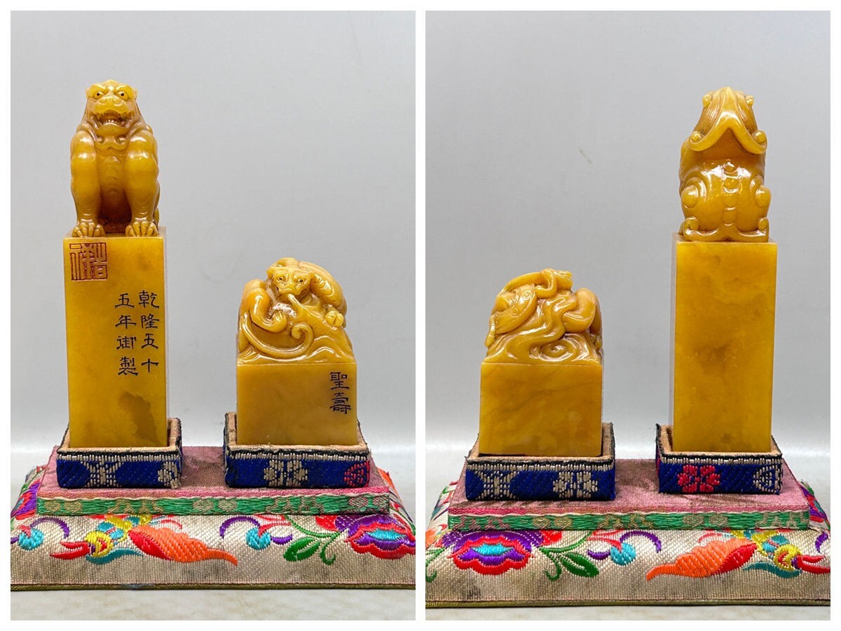 清代 乾隆五十五年御製 老寿山石 田黄石彫 古獣鈕対章【仁】極細工 手彫り 中国古賞物 古美術 蔵出