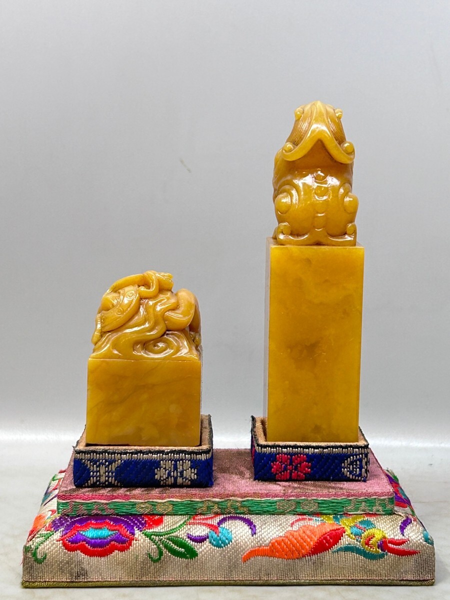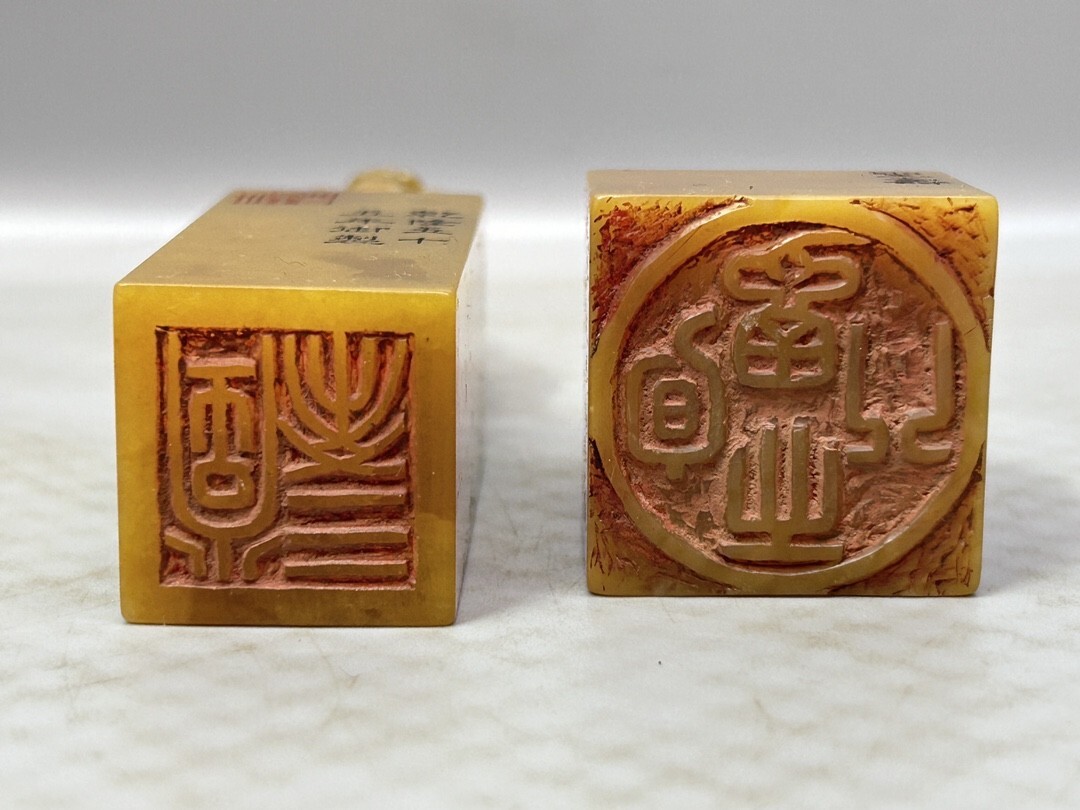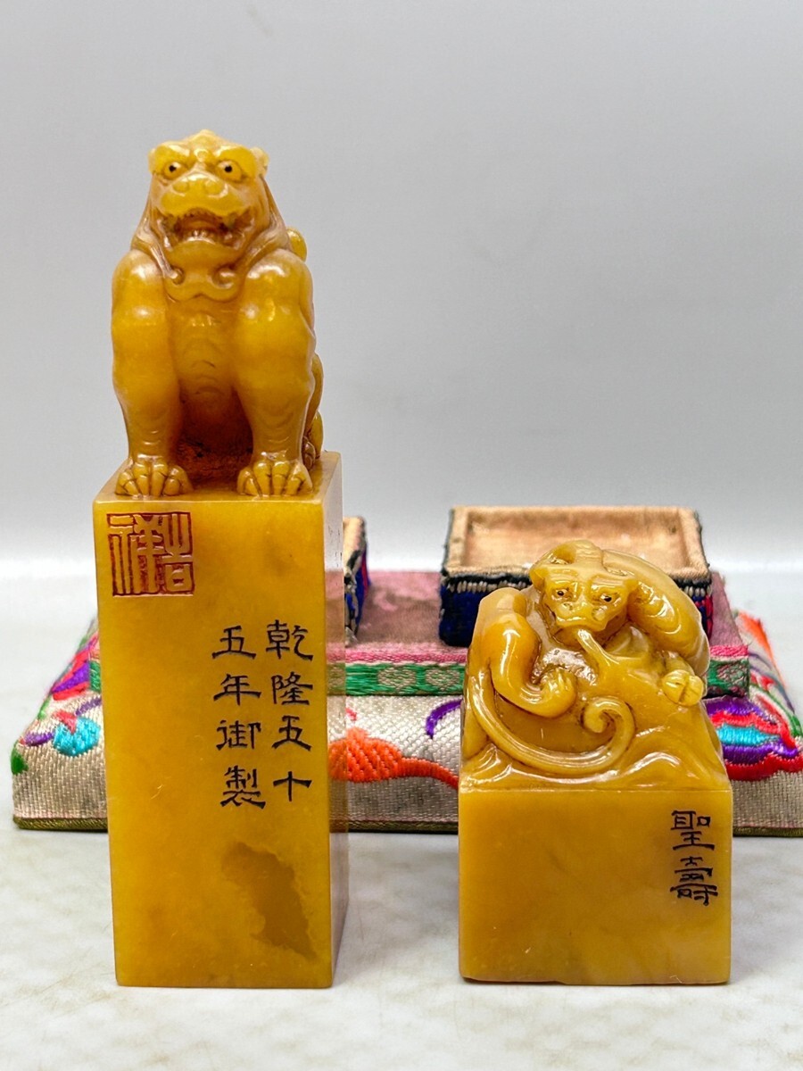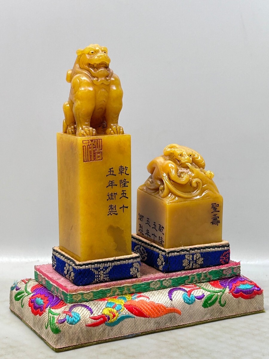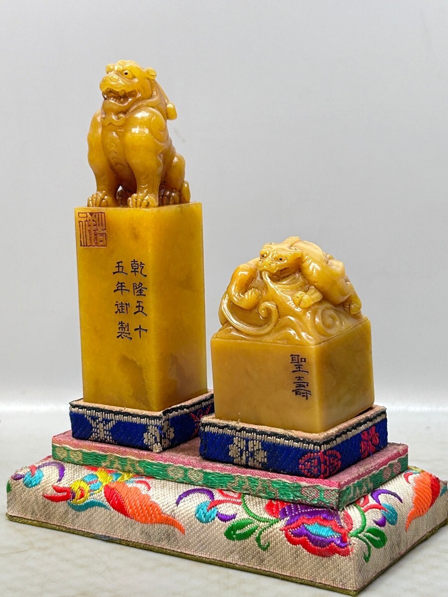 清代 乾隆五十五年御製 老寿山石 田黄石彫 古獣鈕対章【仁】極細工 手彫り 中国古賞物 古美術 蔵出