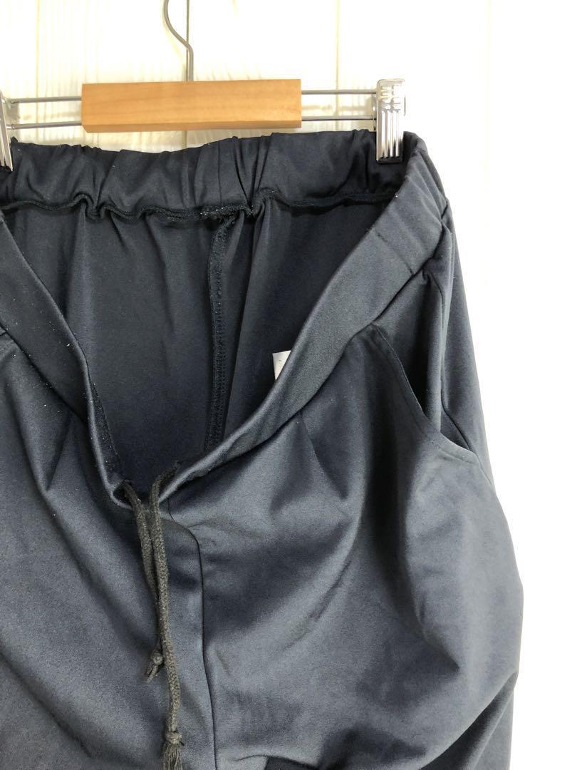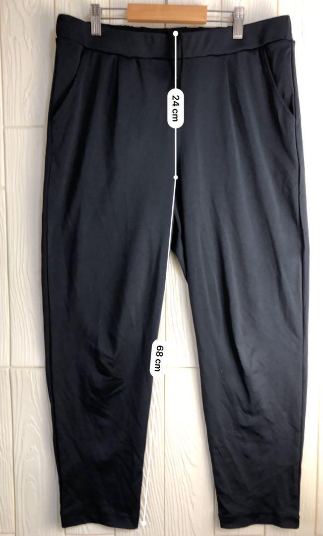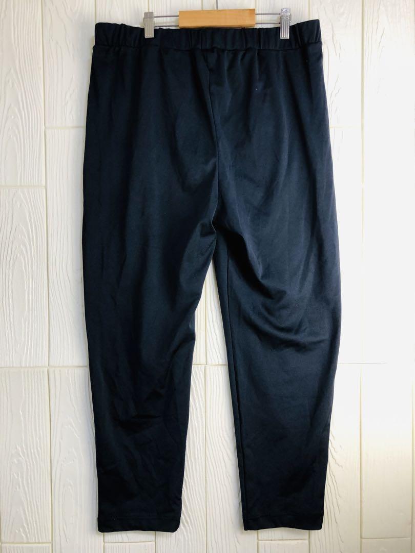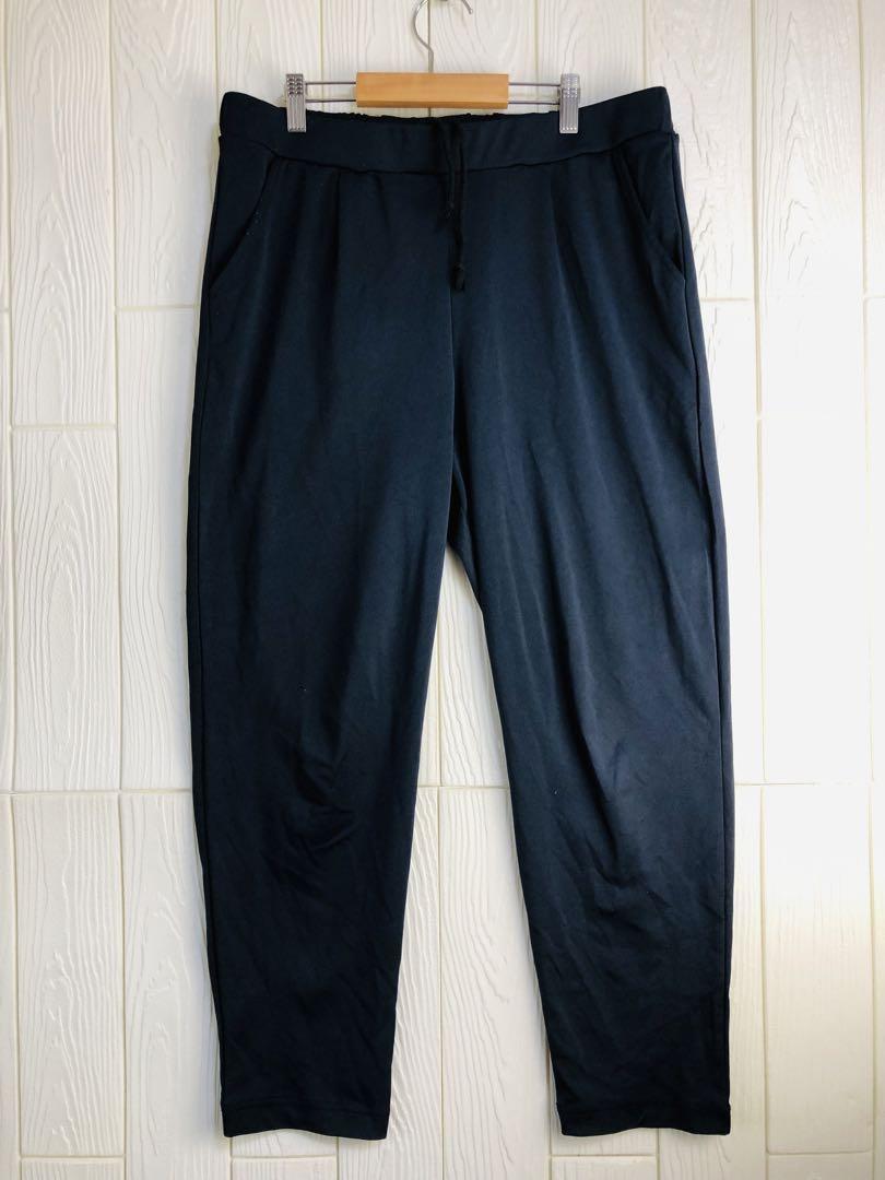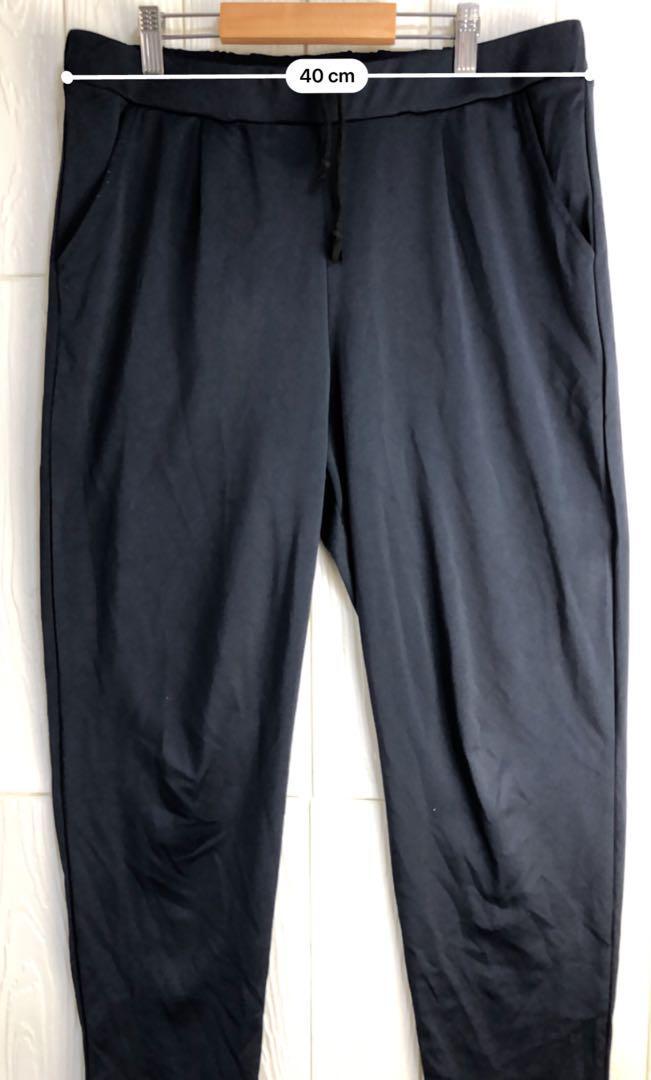 ダークブルーのジョガーパンツ、ウエスト80cm、股下68cm、前股上24cmの快適なフィット感。