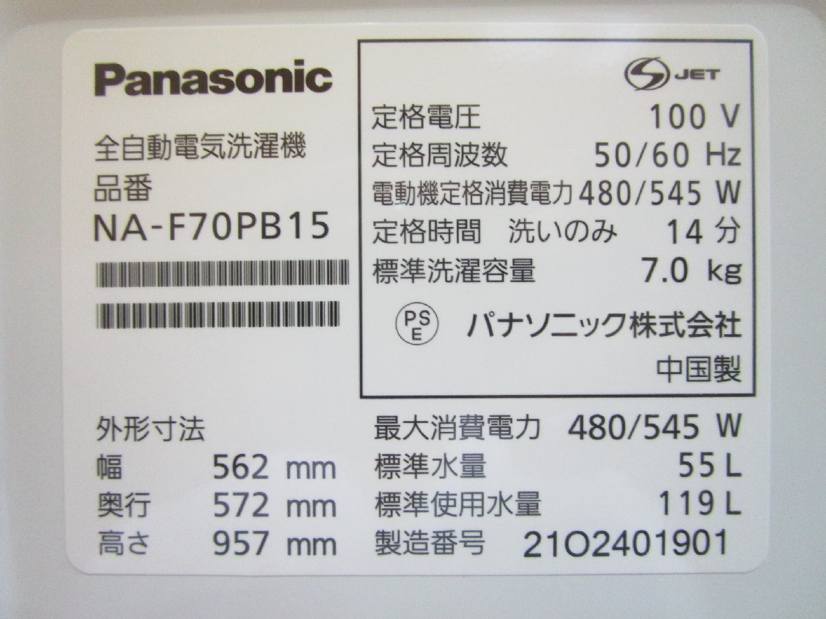 Panasonic パナソニック 全自動洗濯機 7.0kg ビッグウェーブ洗浄 からみほぐし NA-F70PB15 2021年製