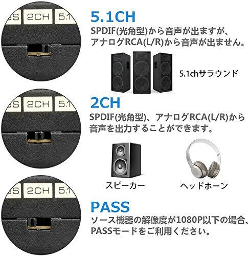 • 【3つのオーディオモード】 音声出力分離器のオーディオモードには、PASS、2.0CH、5.1CH三の音声モードがあります。Pass:ソース機器からのHDMI音声信号を本hdmi rca 分離器に経由してそのままに出力します。2CH:PCM、LPCM、ステレオオーディオフォーマットのみ対応しています。ご利用のモニター/アンプ/スピーカーが5.1CHに未対応の場合、このモードに選べてください。5.1CH:モニタ/アンプ/スピーカーも5.1 CHに対応できることが必要です。