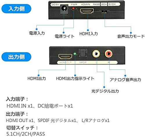 HDMI オーディオ 分離器 音声分離 最大1080P HDMI→HDMI+Audio(SPDIF光デジタル+RCAアナログ出力) 3種類 音声 分離モード PASS 2CH 5.1CH