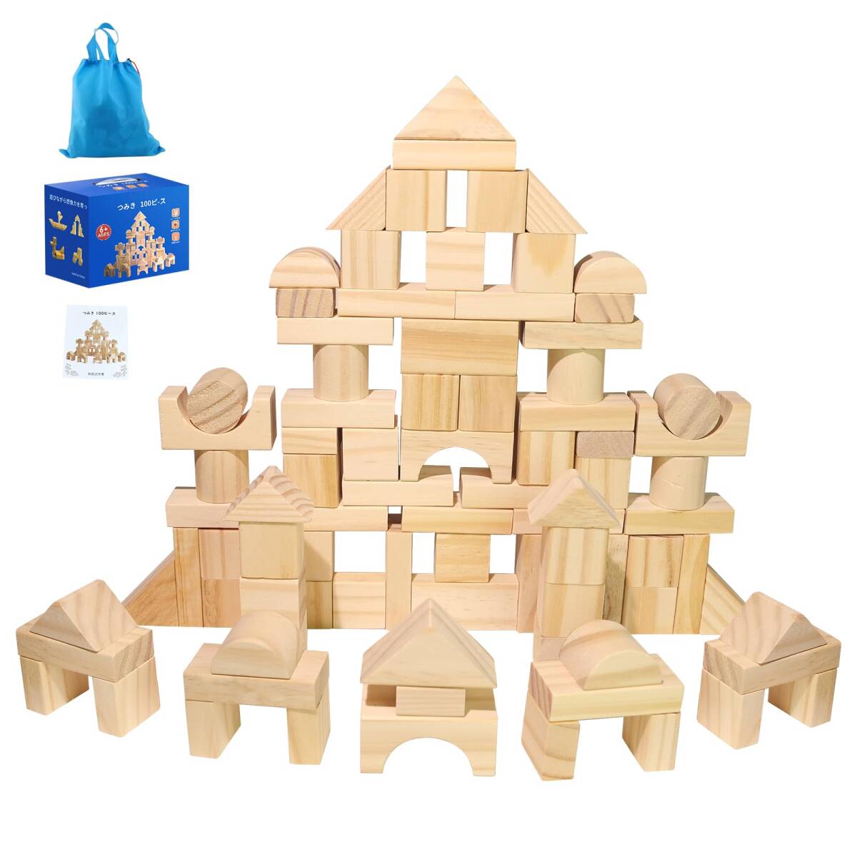 【在庫処分】自然木 積み木 0歳 100ピース入り 1歳 2歳 3歳 9種の形状 赤ちゃん 収納袋付き シンプル 知育玩具 つみき
