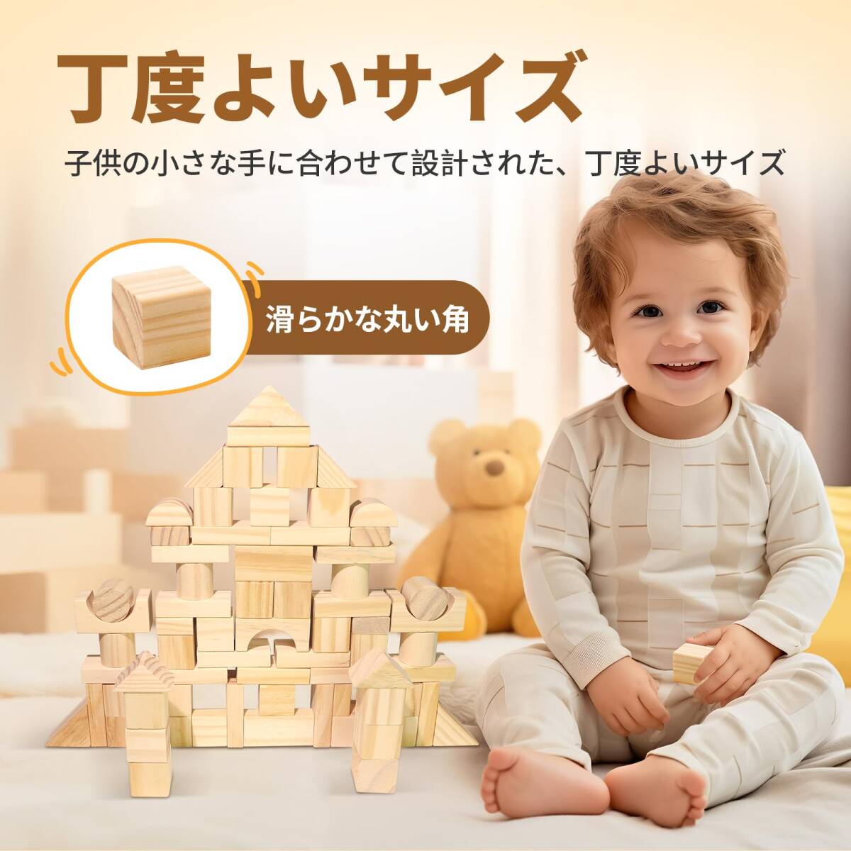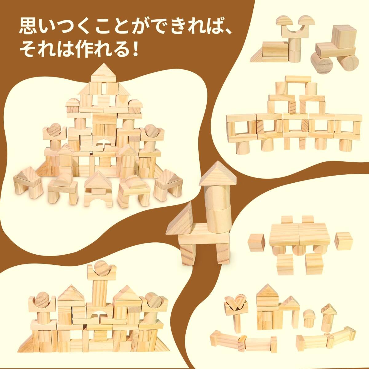【100ピース入り】9種の形状の天然木の積み木100ピースセット、盛りたくさんのつみきで、好きなだけ色んな形に作れる。