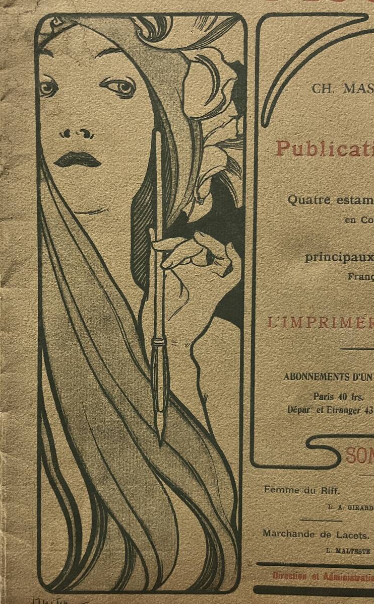 アルフォンス・ミュシャがデザインした「レスタンプ モデルヌの表紙」 サラ・ベルナールがペンを持つ有名なデザインは、この作品で使われたものです。