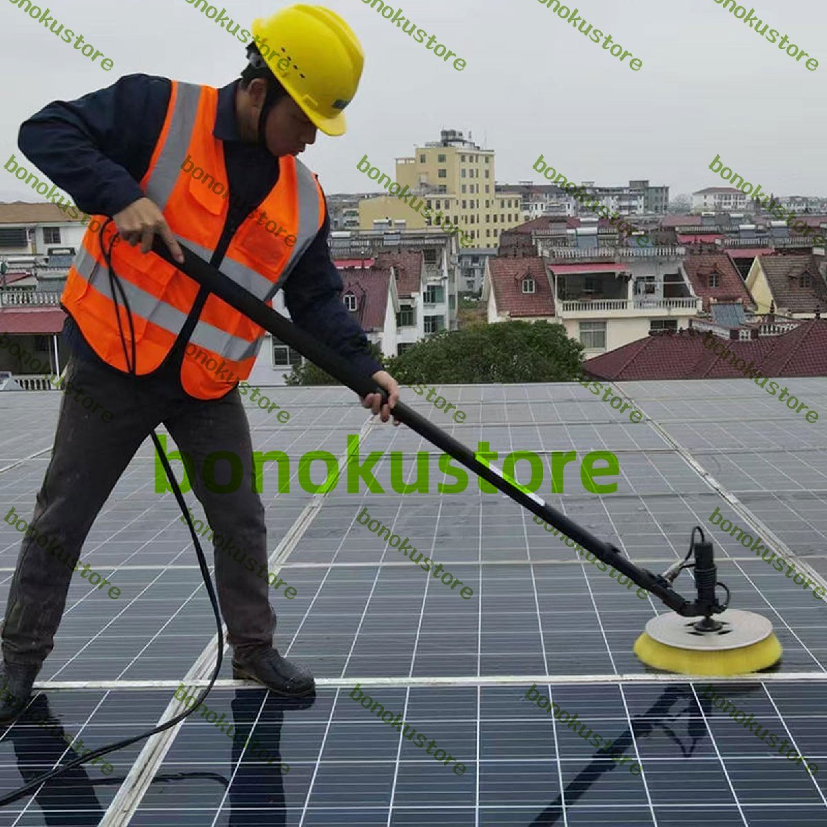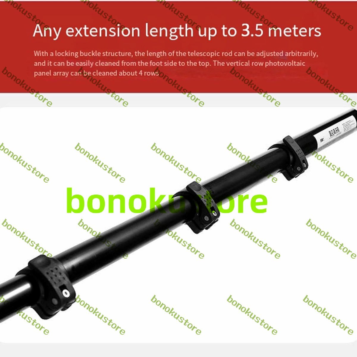 材質:ロック機構を備え、伸縮ポールは最大3.5メートルまで長さ調節可能です。大型で高密度な太陽光発電繊維ブラシは、輸入された超高密度ナイロン糸を手作業でディスク状に編み込んだもので、糸くずが出ず、太陽光発電パネルを損傷しません。