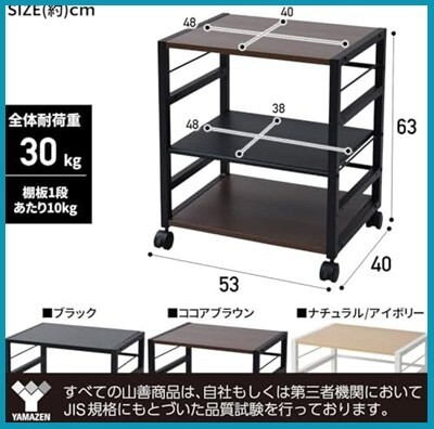 • お客様組立品 本体サイズ:幅53×奥行40×高さ63cm 材質:フレーム=金属(メラミン樹脂)、天板=合成樹脂化粧パーティクルボード(塩化ビニル樹脂) 原産国:中国 棚板サイズ:木製棚=幅48 奥行40cm、スチール棚=幅48 奥行38cm