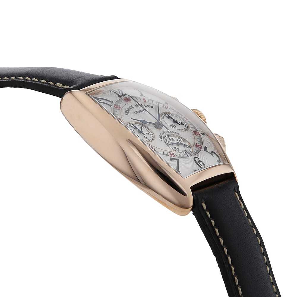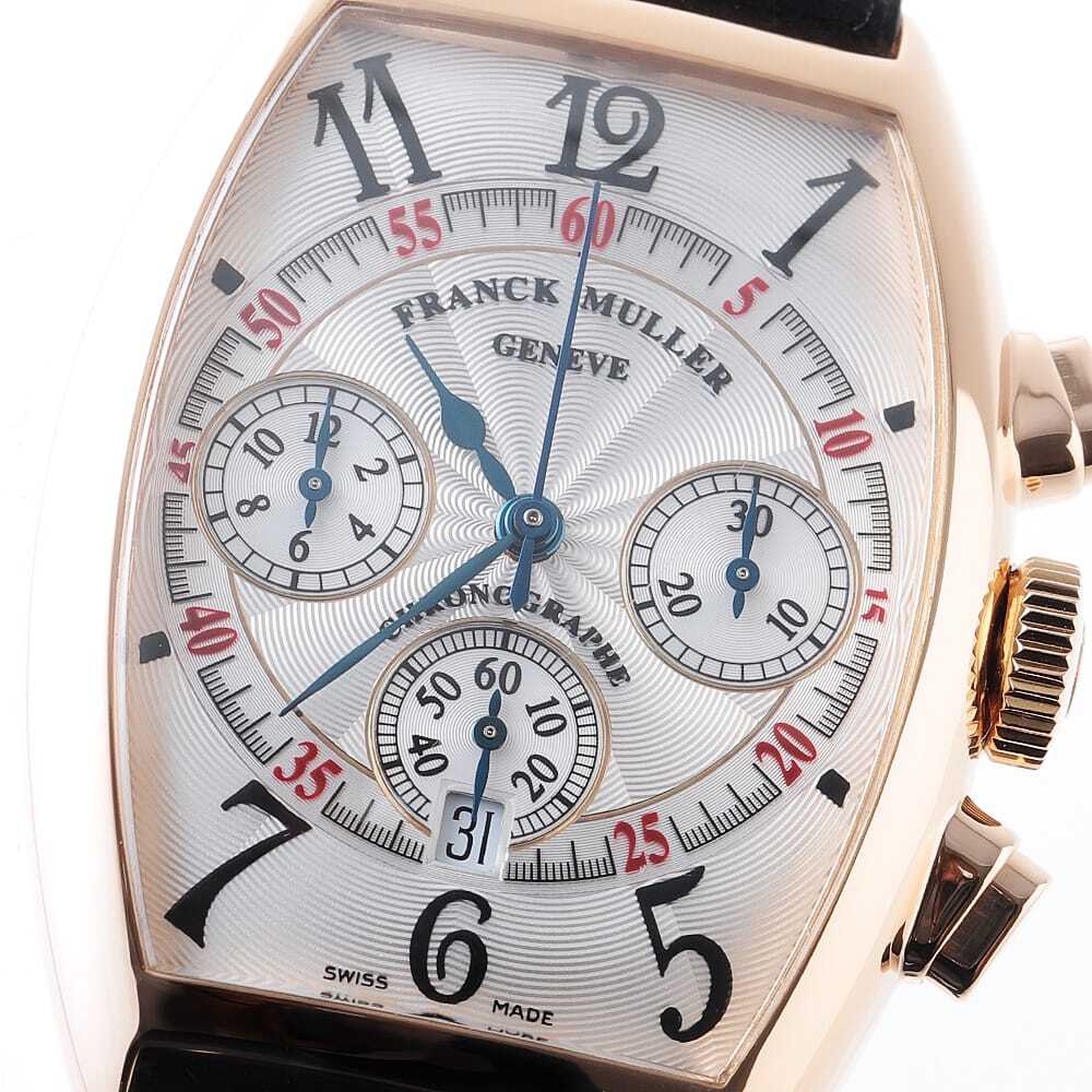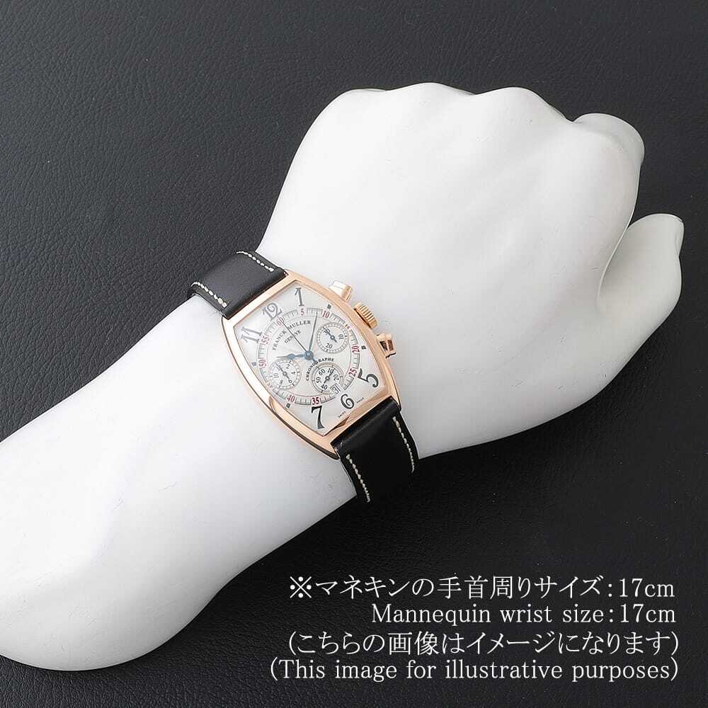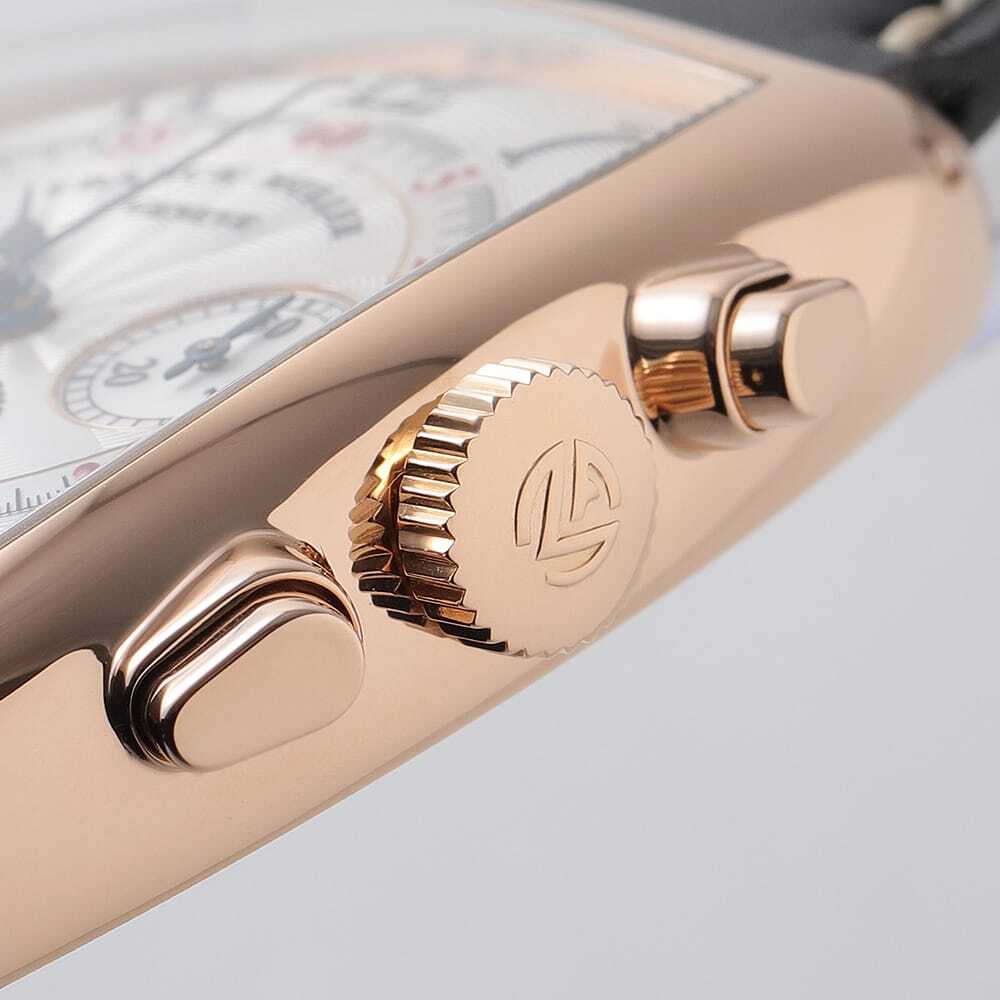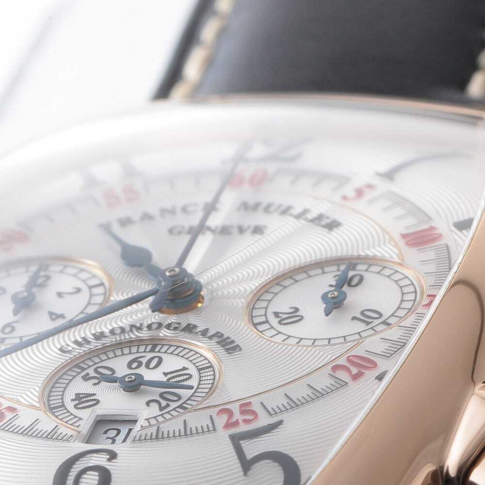 モデル情報 | 美しい3次元曲線で構成されたトノー(樽)型ケースが印象的な、フランクミュラーらしさ溢れる一本です。ケースには華やかなピンクゴールドを採用し、アールデコ様式に着想を得た独特のデザインがクラシカルで上品な雰囲気を漂わせます。3時位置に30分計、6時位置にスモールセコンドと日付表示、9時位置に12時間計を備えたクロノグラフを搭載。視認性と操作性に配慮されたレイアウトで、実用性にも優れています。文字盤に刻まれた美しいギョーシェ彫りも相まって、まさに芸術性と機能性が美しく調和したフランクミュラーならではのタイムピースです。 |