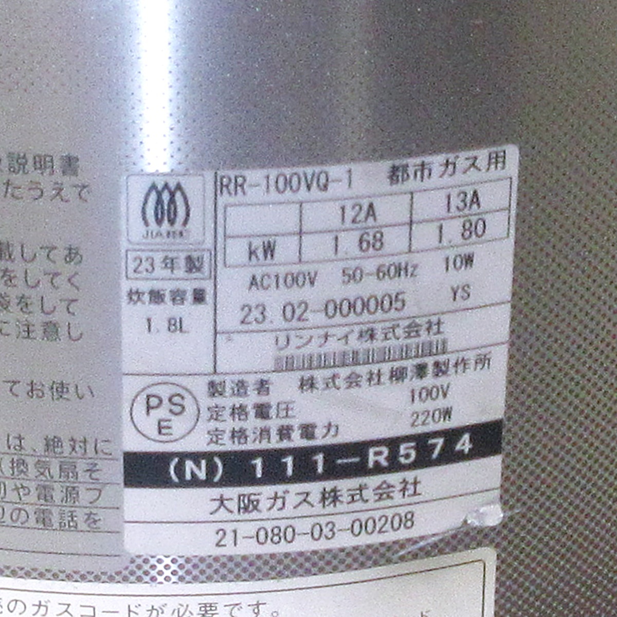 商 品 紹 介 | ■型番■ RR-100VQ-1 ■大阪ガス型番■ (N)111-R574 ■年式■ 2023年製 ■外形寸法■ 幅309x奥行277x高さ359mm ■質量■ 約6.4kg ■ガス種別■ 都市ガス 12A 13A ■ガス接続■ ガスコード ■最大ガス消費量■ 1.80kW ■電源■ AC100V 50/60Hz ■消費電力■ 220W ■炊飯容量■ 0.36~1.8L ■備考■ 未開封品のガスコード付属 ■発送サイズ■ 120サイズ ■保証期間■ 納品日含め1ヶ月となります ■状 態・ご注意点■ あくまで中古品です。キズ・落ち切らない汚れ・サビ等もございます。画像をご確認下さい。 細部まで気にされる方は、購入をお控え下さい。 動作確認済みです。出荷前にも最終点検を行いますので、中古品ですが安心してご購入していただけます。 画像にある商品・付属品以外のもの(台車・背景等の無関係なもの)は含みません。 寸法は素人採寸のため、多少の誤差はご容赦願います。 |