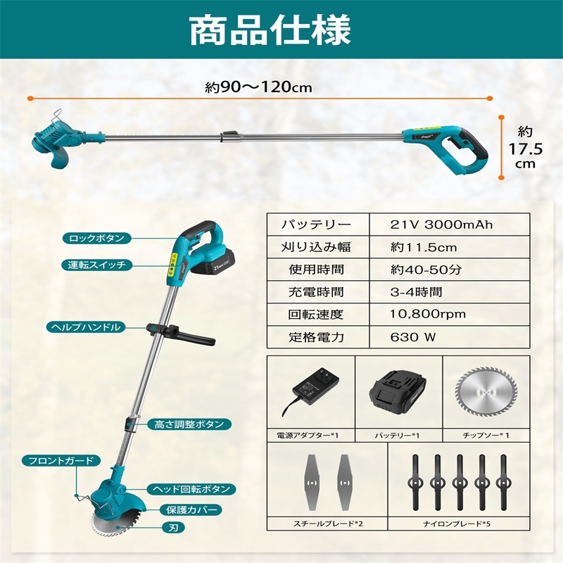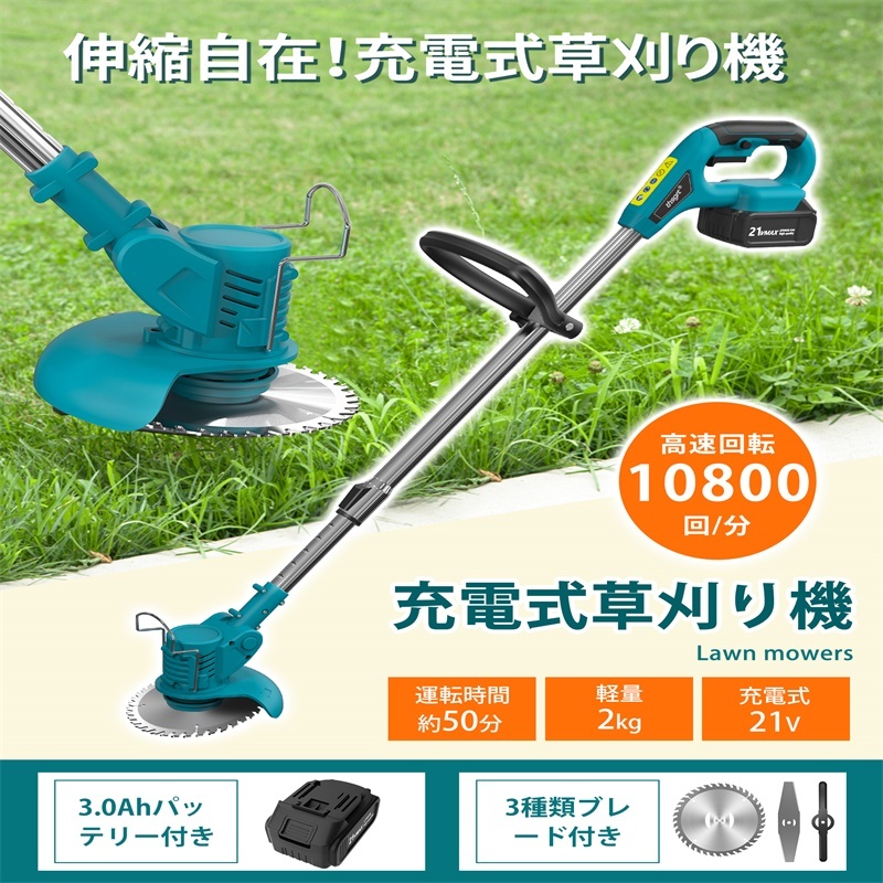草刈機 充電式 コードレス 芝刈り機 家庭用 女性 軽量 伸縮 3種類替刃 21V 角度調整 電動刈払機 安全 枝切り PSE認証