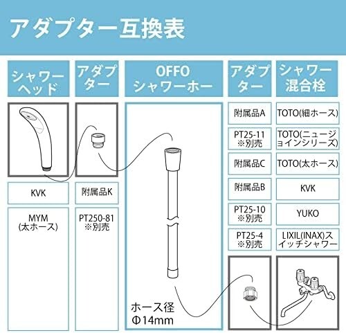 TOTO太ホース、TOTO細ホース、KVK水栓は付属のA,B,Cアダプターを使えば接続できます。