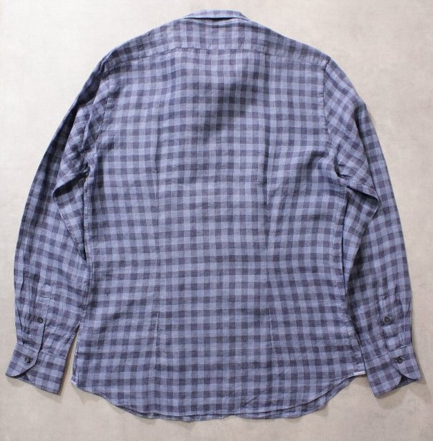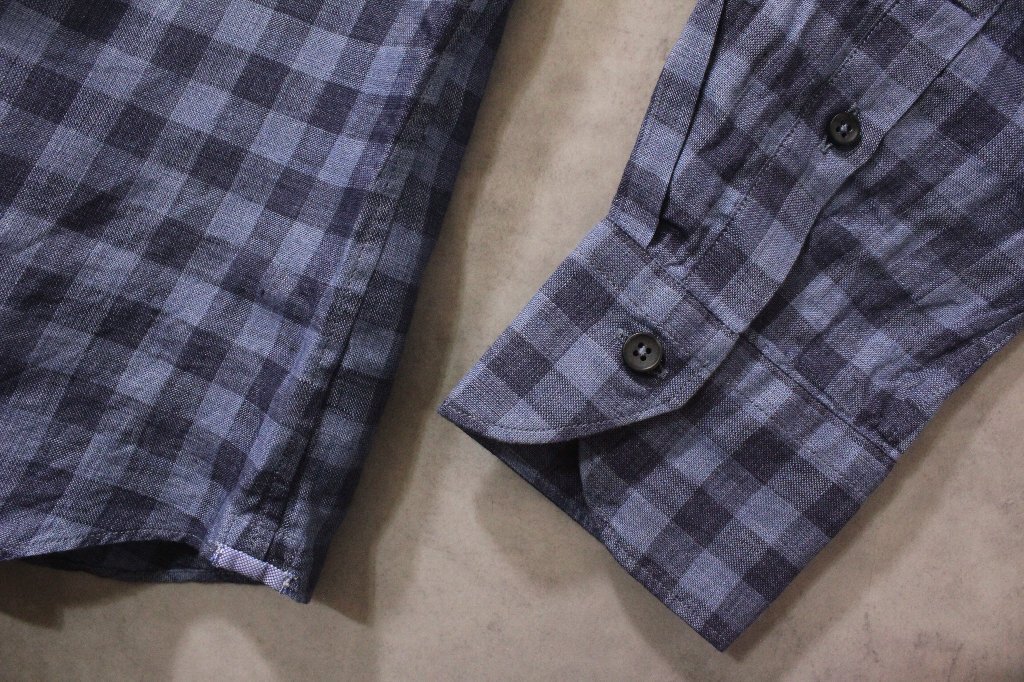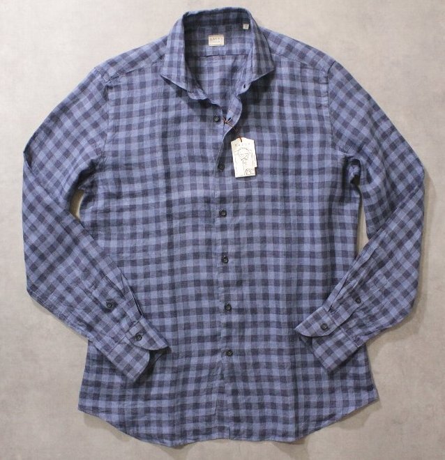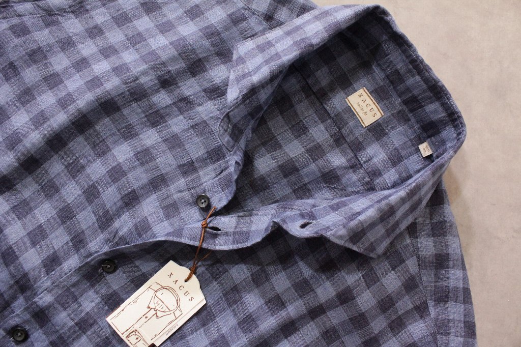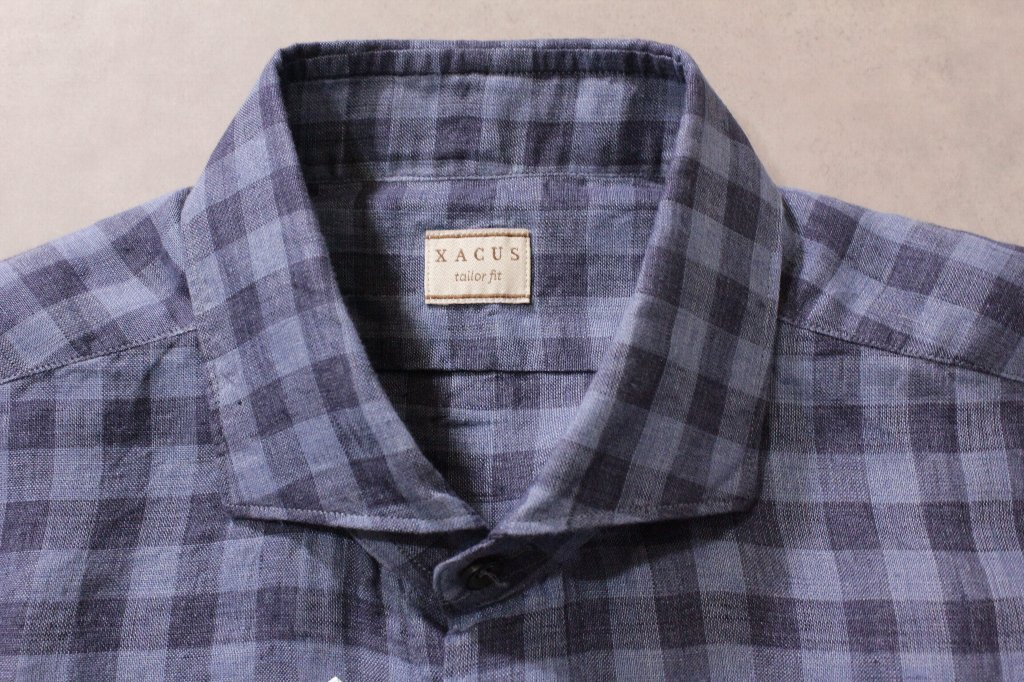 XACUS★新品3.5万円程度 ザッカス カッタウェイ衿のリネン長袖シャツ 42cm ブルー系ブロックチェック柄 ザカス