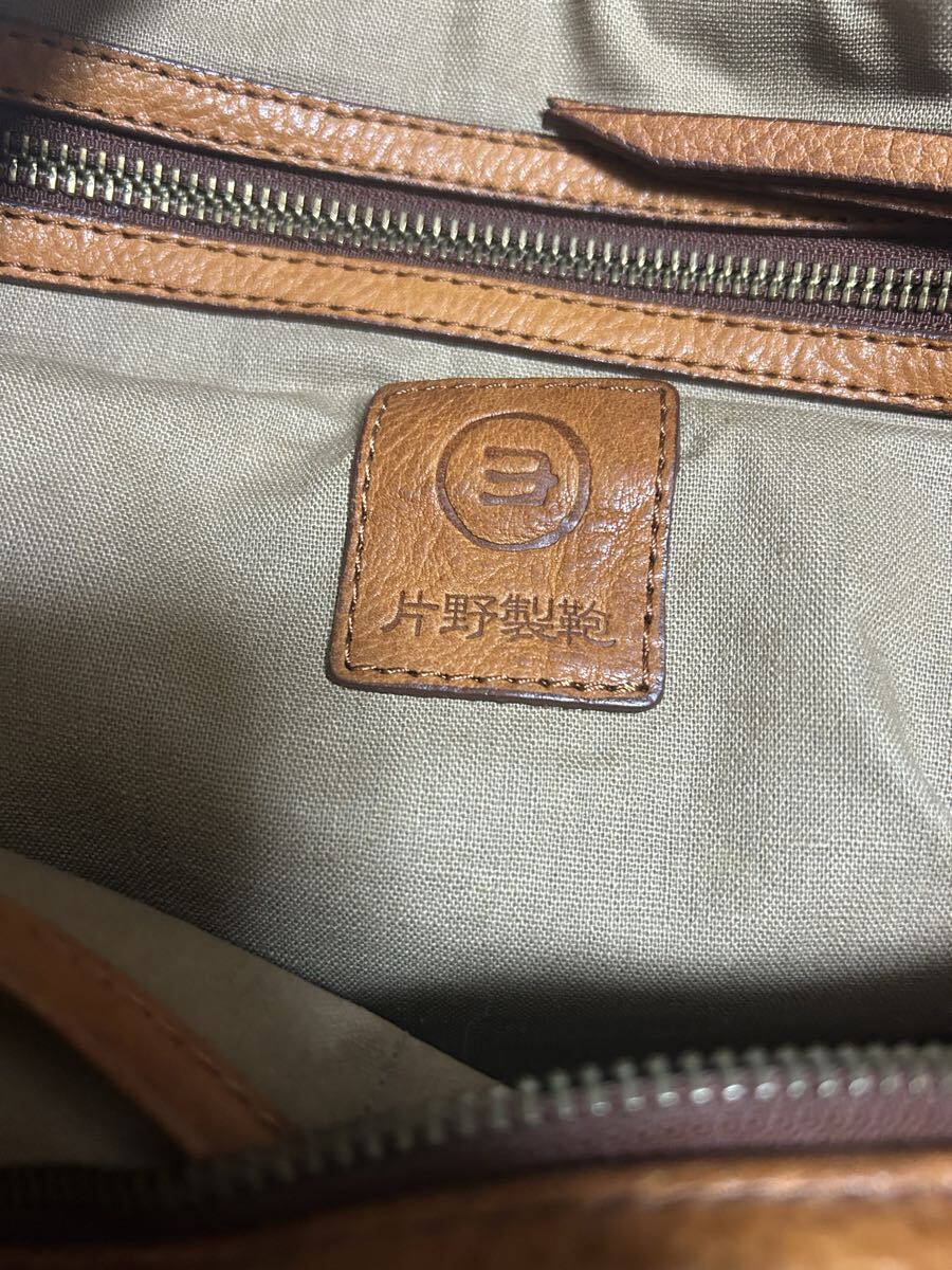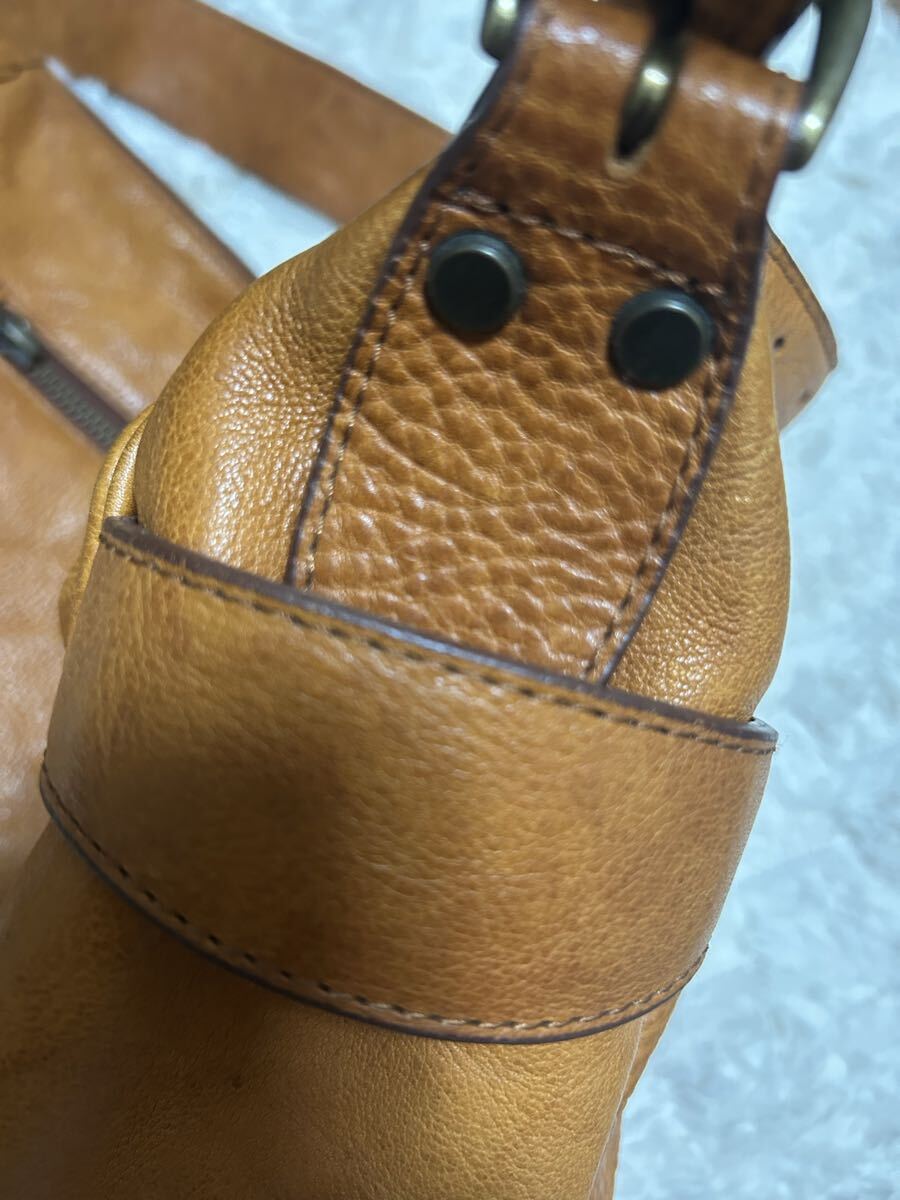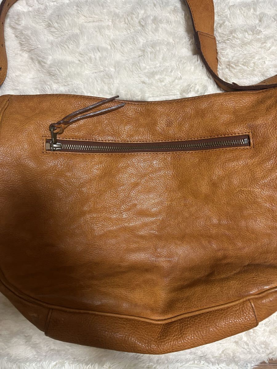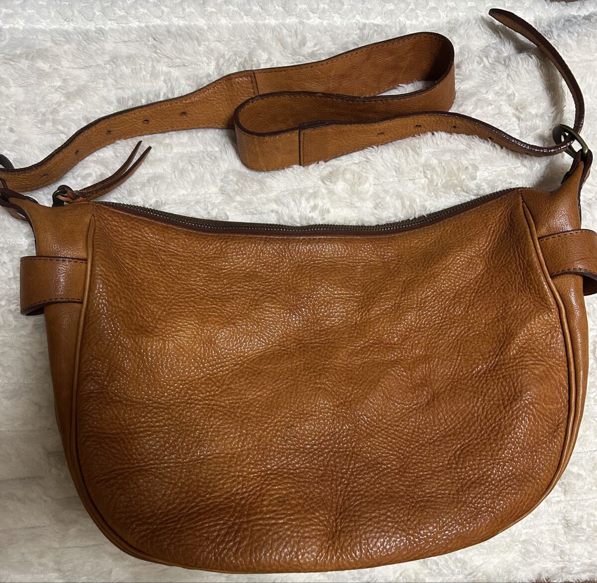 柔らかいレザーのブラウンショルダーバッグ、外側にファスナーポケット付き。