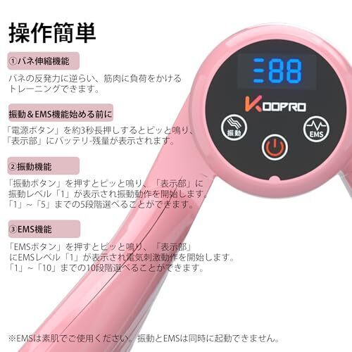 • 【革新な多機能設計】バネ伸縮機能、振動機能、EMS機能を搭載!1.バネ伸縮機能:バネの反発力に逆らい、筋肉に負荷をかけるトレーニング。2.振動機能:振動(モ-タ-振動)で筋肉にアプローチ。3.EMS機能:EMS(電気刺激)で効率よくトレーニング。他社と比べて、倒的な優勢があります!