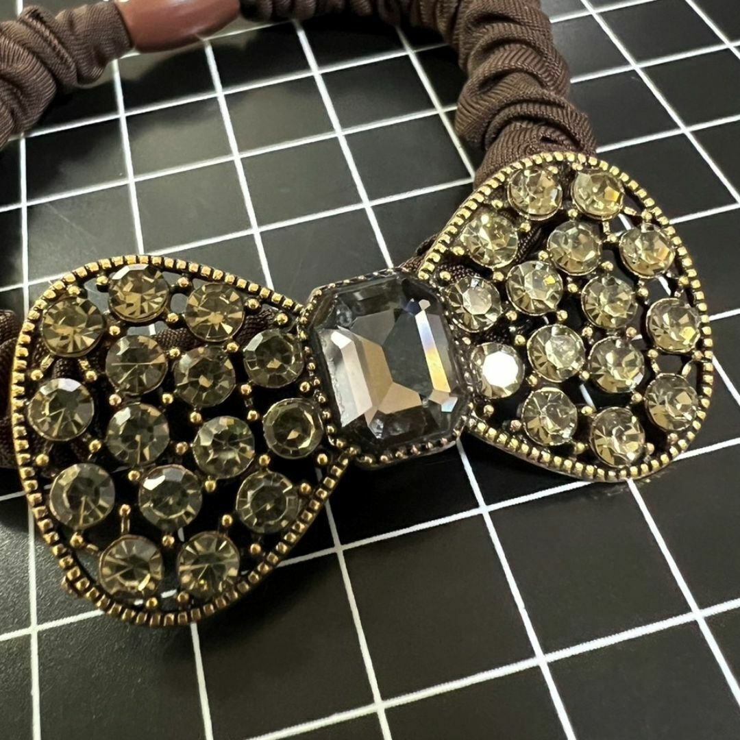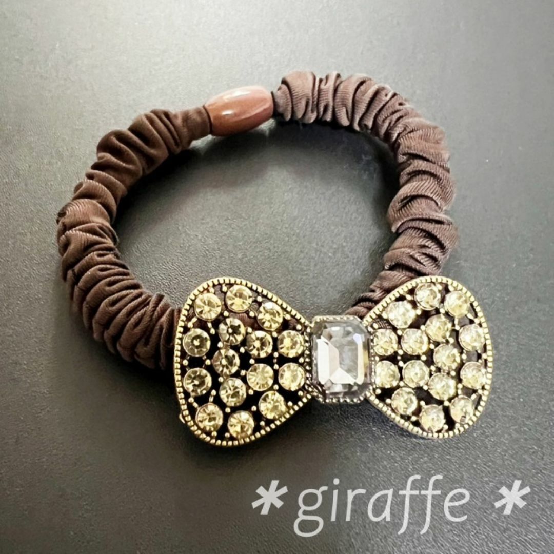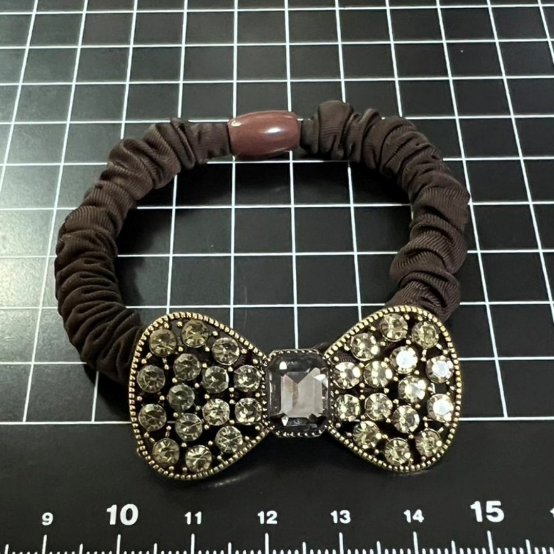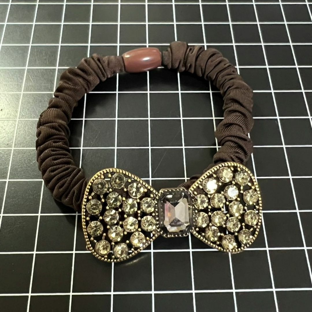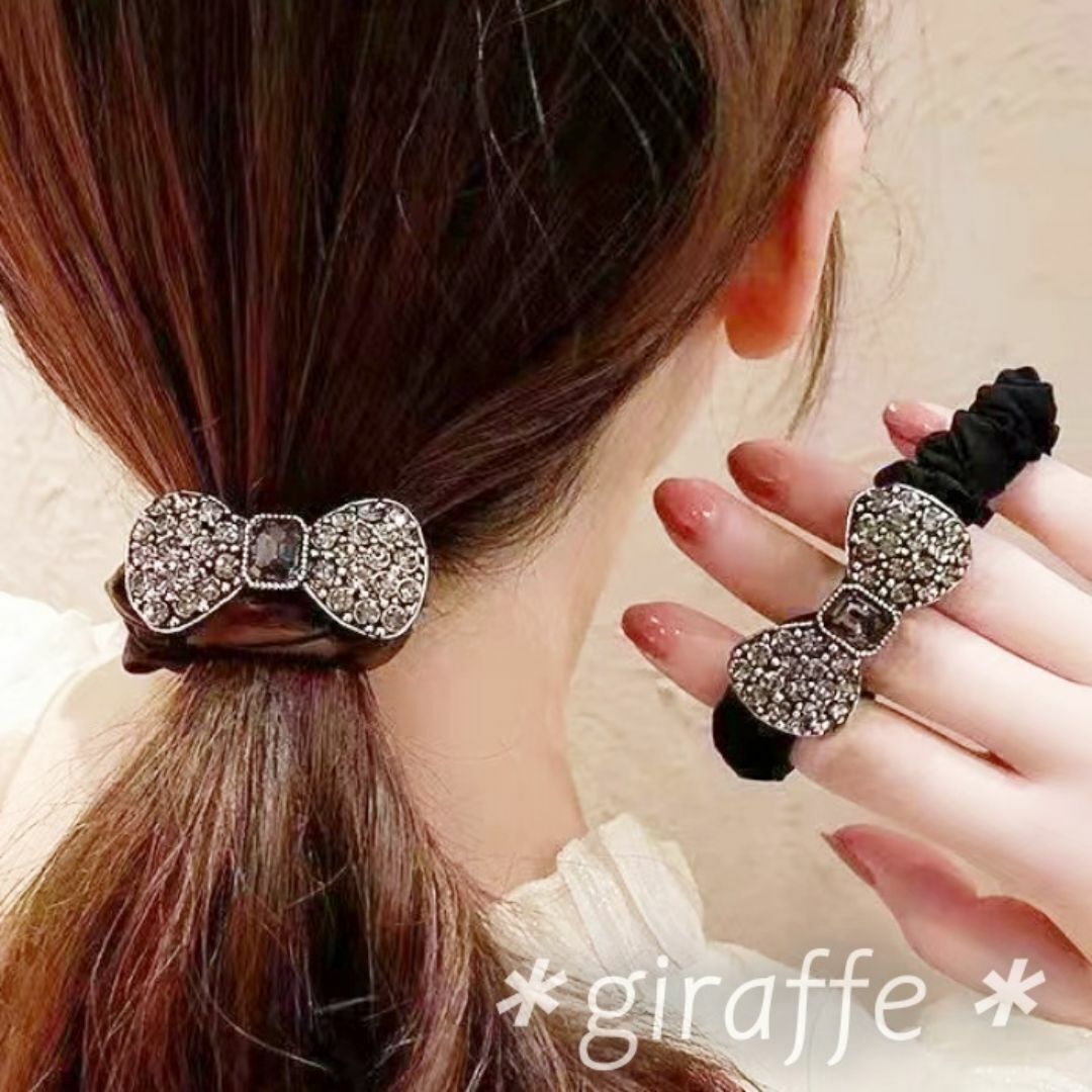 キラキラと輝くラインストーンが綺麗なリボンのついたシュシュです。