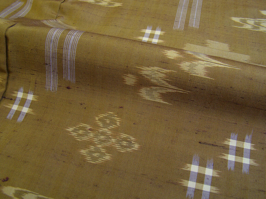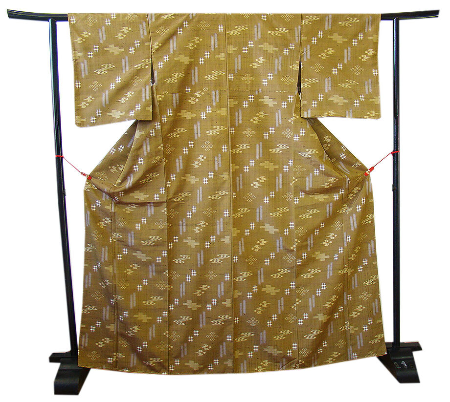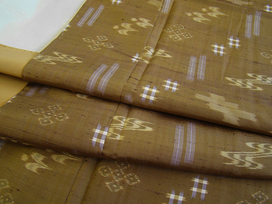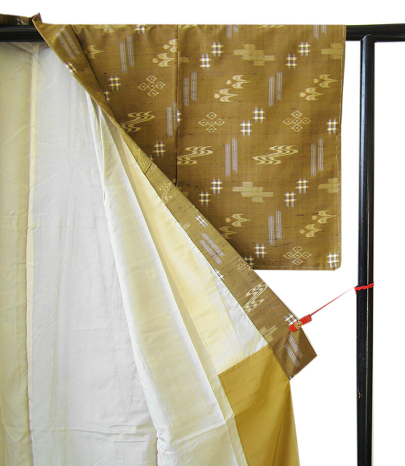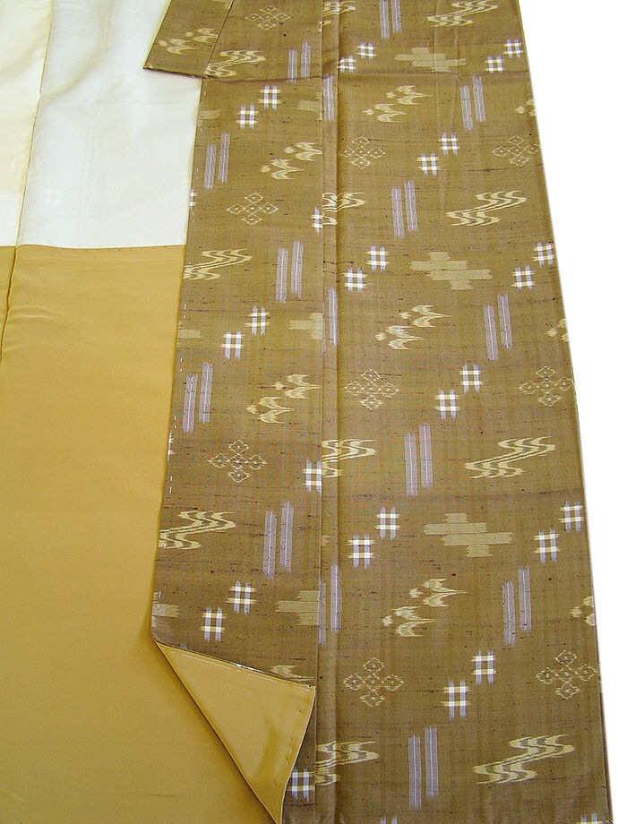 | 商品説明 | こちらのお品は「袷」ですので10月から5月までお召頂ければと思います。 海に囲まれ、豊かな自然のなかで育まれた素朴で温もりを感じさせる その風合いが着物通の方々の心を魅了する、沖縄県伝統工芸品の「琉球絣」です。 しなやかな手触りの中にさらりとして心地良いハリのあるその独特の風合。 シャキッとした素材感はサラッとした着心地が魅力的の伝統工芸品の琉球絣。 シワになりにくく、日中のお出かけにも気兼ねなくお召し頂けます。 渋い鶯茶色地に白、灰、ベージュ色の井桁や燕等の琉球絣の織柄、 落ち着いた雰囲気を醸すシックな色彩を基調に、一面にシンプルな絣を織り成しました。 民芸的でありながらも都会の街並みにもピッタリと調和する小粋な仕上がりとなっております。 八掛は木蘭色(正絹)、バチ衿仕立て、幅広い年代の方にお召頂けます、 残念ながら証紙・残布はございませんが手触りや織等から琉球絣だと思われます。 |