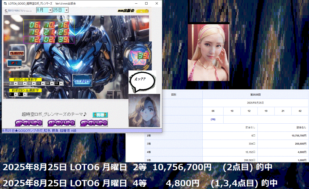 LOTO6 専用予想ソフト 新作★LOTO6_GOGO_超時空ロボ_グレンマーズ 2025年8月25日 LOTO6 月曜日 2等 10,756,700円 (2点目) 的中♪タイム