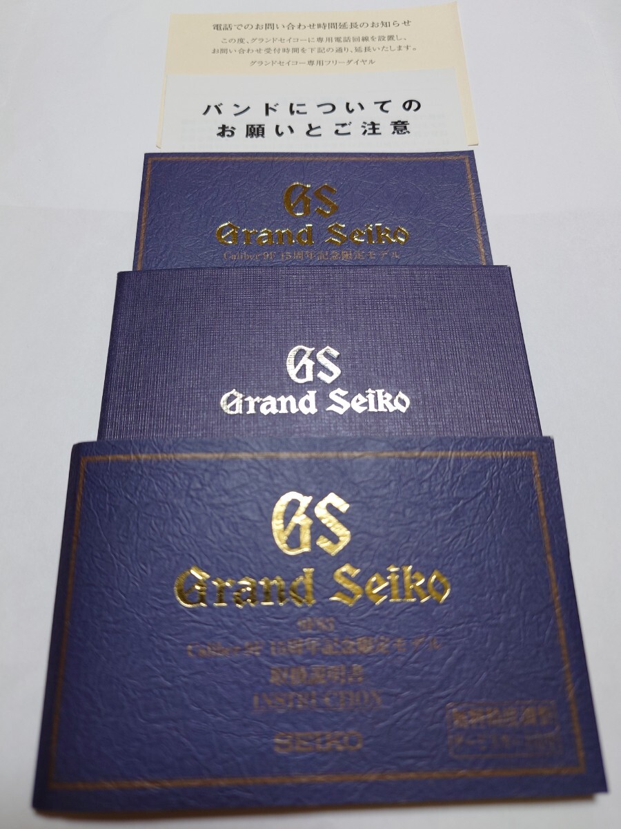 取扱説明書、保証書(記名あり、期限切れてます)、無料精度調整サービスカード、バンドについてのお願いとご注意、電話でのお問い合わせ時間延長のお知らせ、タグが付属します。