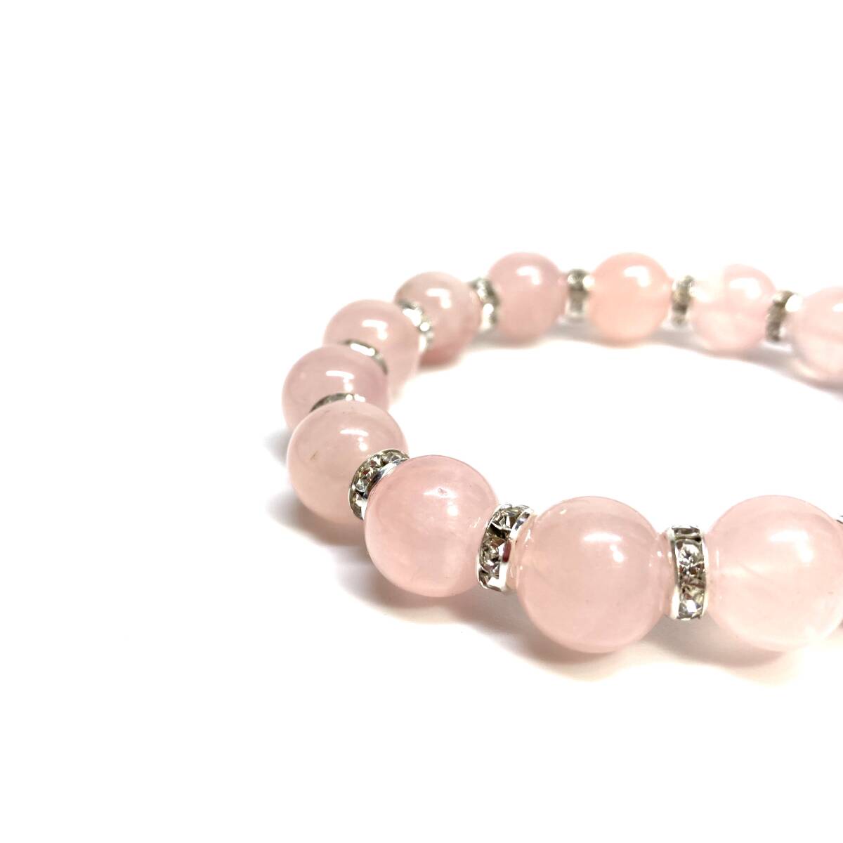 こちらは、12mm玉のローズクォーツを使用したブレスレットです。石との間にはロンデルを挟み高級感を演出しています。シンプルなデザインですのでどんなコーディネートとも合わせ易いブレスレットです。石大きさは12mm玉です。内周約18cmです。(サイズ変更の場合は取引ナビにてご連絡をお願いします。) 数に限りがございますので気になる方はお早めにどうぞ。