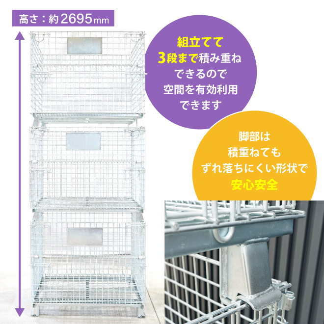●メッシュ構造で通気性に優れ、可視性が高く倉庫内の整理整頓に最適です ●軽量ながら強い強度があるので、様々な使い方が可能 ●三価クロムメッキ仕上げで錆に強く、工事現場での資材の保管や運搬にもおすすめです ●前面扉の上部は開閉出来るので、物の出し入れがしやすい ※積重ねた状態での前面扉の開閉はしないでください ●4方向からフォークの差込みが可能なので、フォークリフトやハンドリフトを使用しての運搬が可能です ●組立てて3段まで積み重ねできるので、空間を有効利用できます ●折りたたみ時にはコンパクトになり、積み重ねて収納する事ができます ※本商品にキャスターは付いておりません |