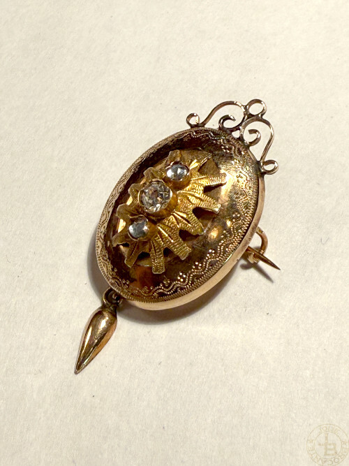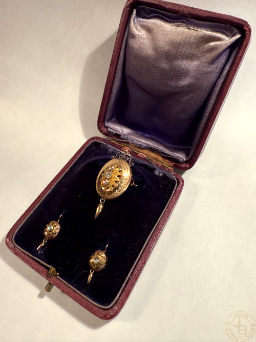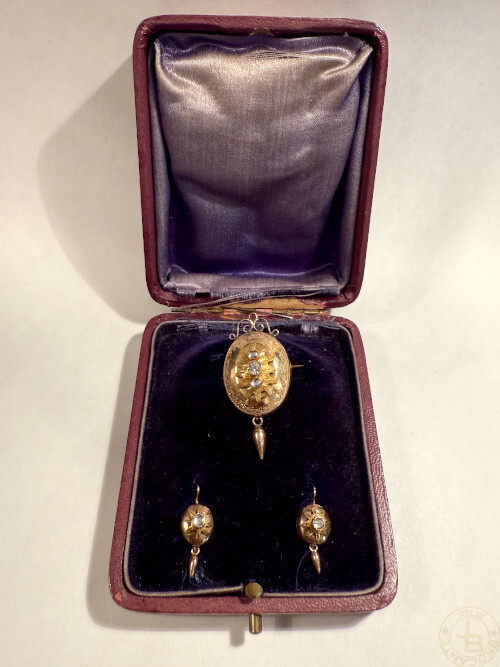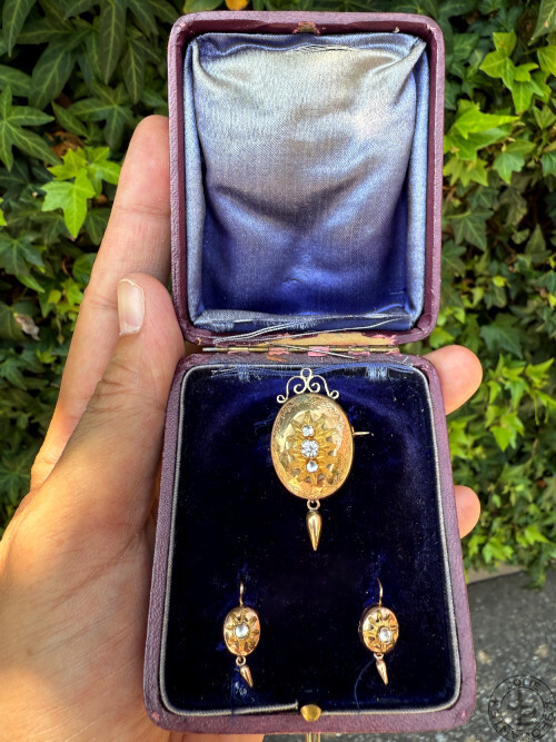 オリジナルのケースに収まったブローチとピアスのデミパリュール。