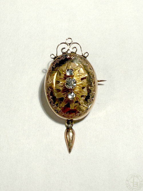 ブローチは中心に3石のクォーツが並んでいます。中心はブリリアントカットに似たカット、