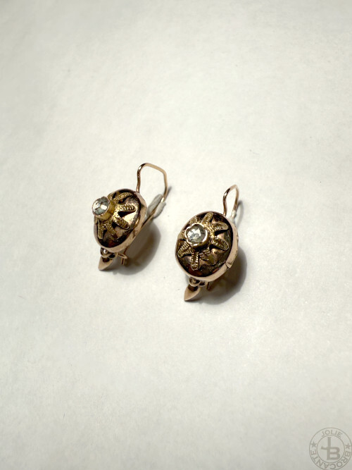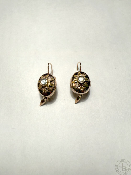 地金部分は14金でブローチ・ピアス共に打出しでボリュームを出していて