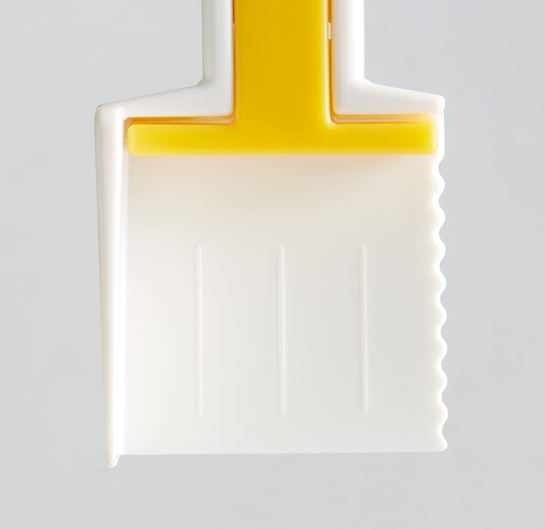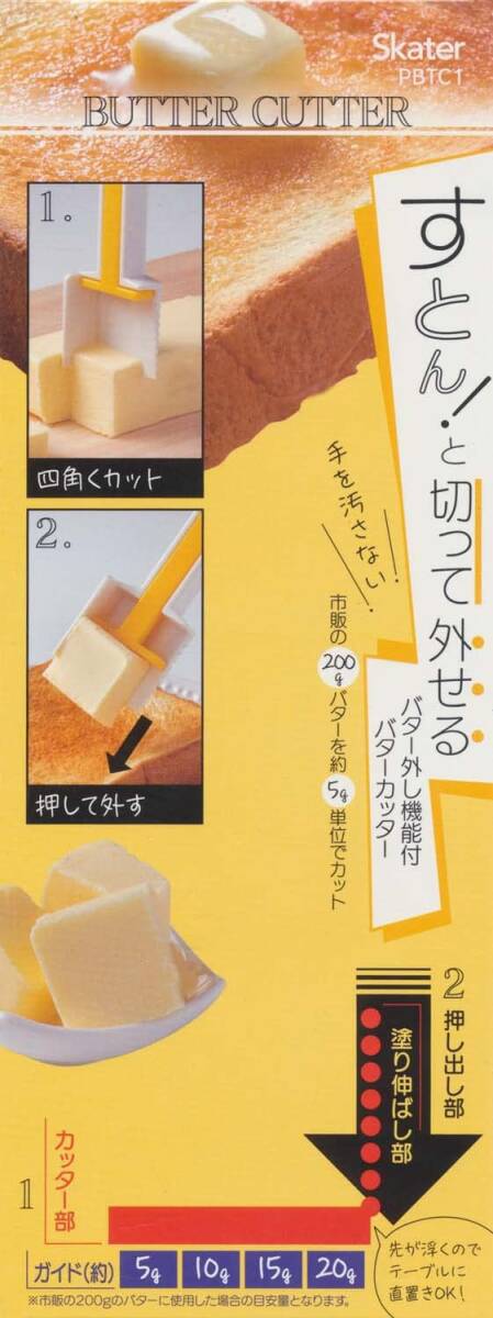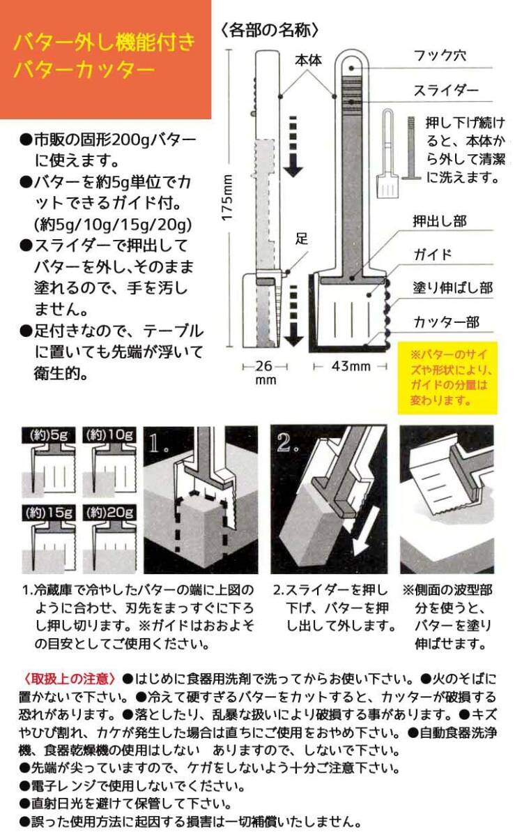 市販の200gバターに使えます バターを約5g単位でカットできるガイド付き スライダーで押し出してバターを外し、そのまま塗れるので、手を汚さない 足付きなので、テーブルに置いても先端が浮いて衛生的 バターを、四角くカットできる