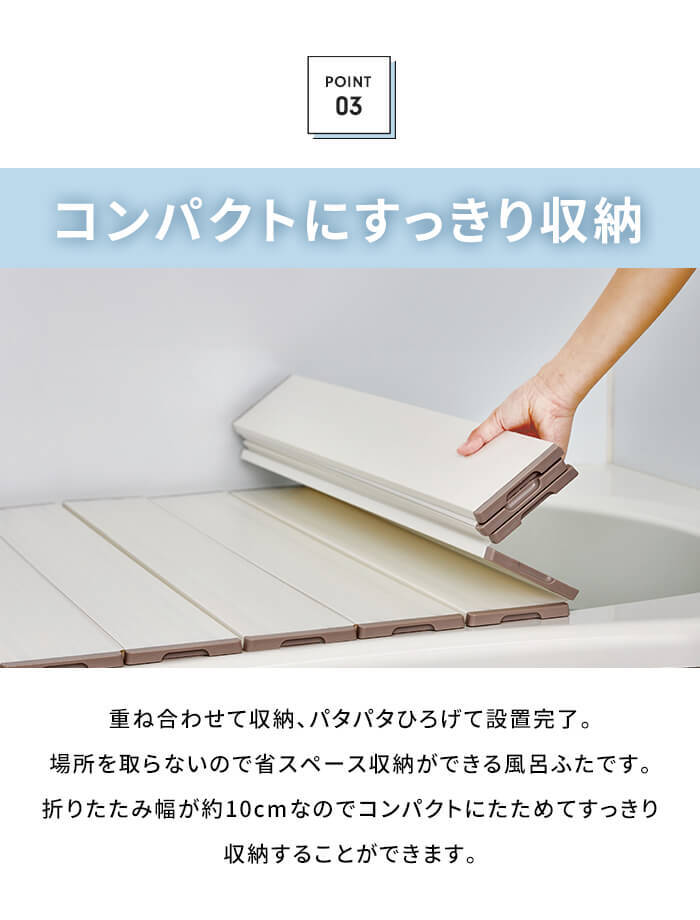 Ag抗菌折りたたみ式 風呂ふた。 〔POINT〕Ag抗菌加工&防カビ加工 繋ぎ目にAg+銀イオン抗菌加工が施してあり、菌やカビによる嫌なヌメリの繁殖を抑えて風呂ふたをきれいに保ちます。 〔POINT〕フラットな形状でお風呂掃除が簡単 表面・裏面がフラットな形状で軽く洗って水を流せばお掃除完了。 (風呂ふたを洗う際は柔らかいスポンジや中性浴室用洗剤を使用してください。) 〔POINT〕コンパクトにたためてすっきり収納 折りたたみ幅約10センチと場所を取らなず省スペースで収納OK。 パタパタ広げて設置、重ね合わせて収納完了。 〔POINT〕軽量設計 毎日使うものだから軽量でストレスフリーな使い心地。 軽量なのでお子様からお年寄りの方でも簡単に扱えます。 〔POINT〕安心・安全の日本製 【使用上のご注意】 ◎購入直後は折りたたみクセが残っていることがありますが、徐々に解消していきます。 ◎24時間風呂ではご使用をお避け下さい。 ◎風呂水洗浄剤(塩素殺菌剤)をご使用しないでください。 ◎柑橘類(柚子・みかん・レモンなど)を使用しますと風呂ふたを傷める恐れがあります。 ◎ベビーバスなどを風呂ふたに乗せて使用しないでください。 |