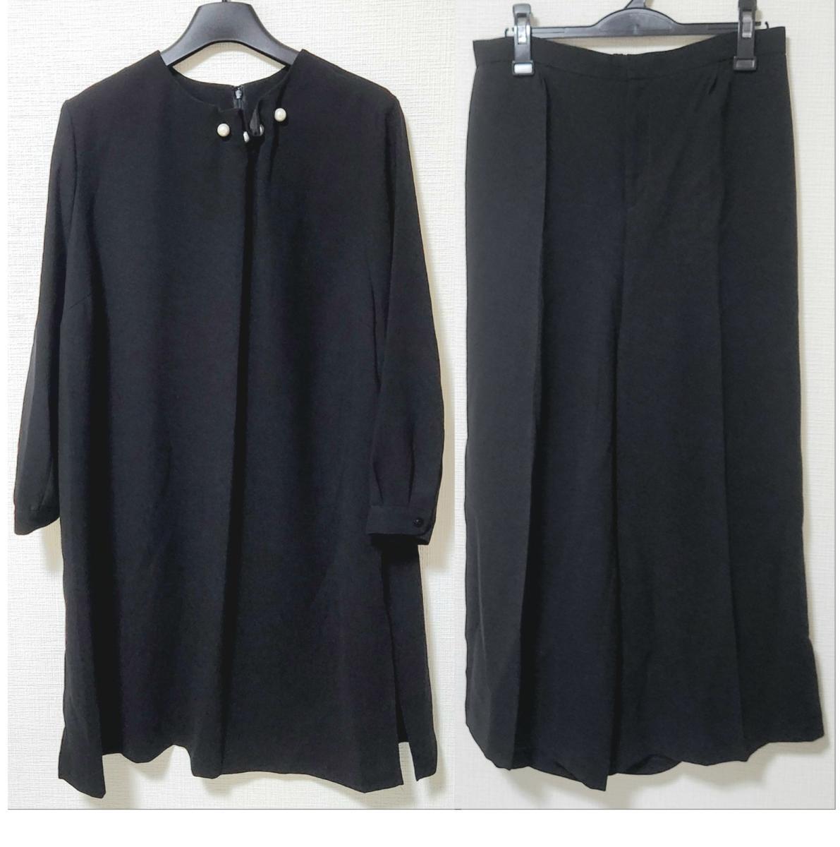 パール調デザインのロングブラウスとセミワイドパンツの上下2点セットです