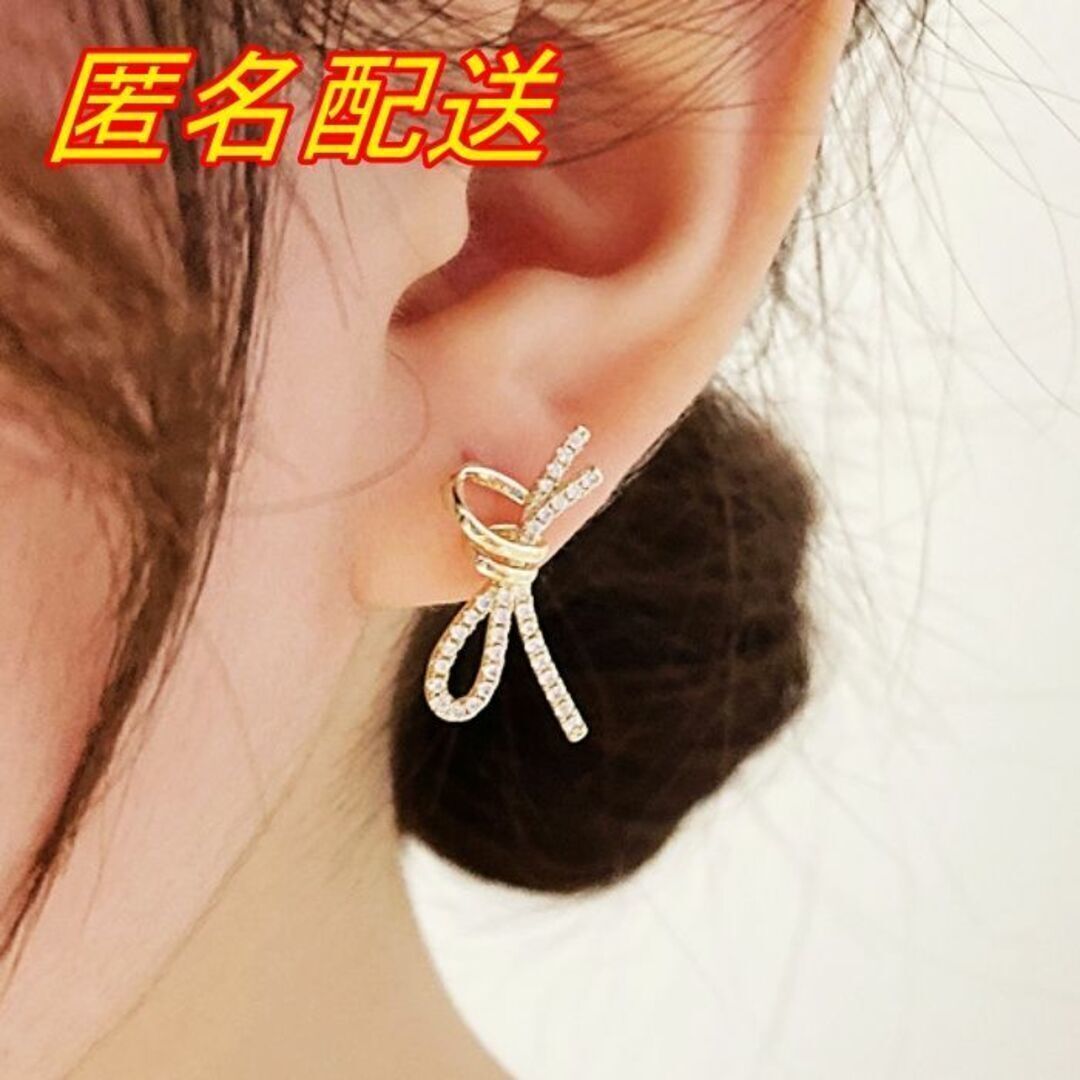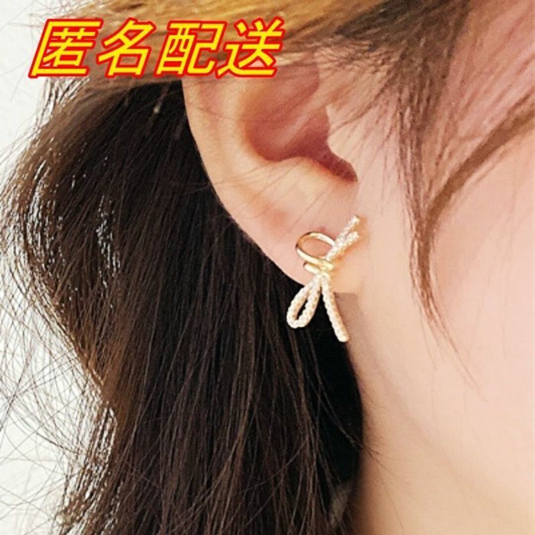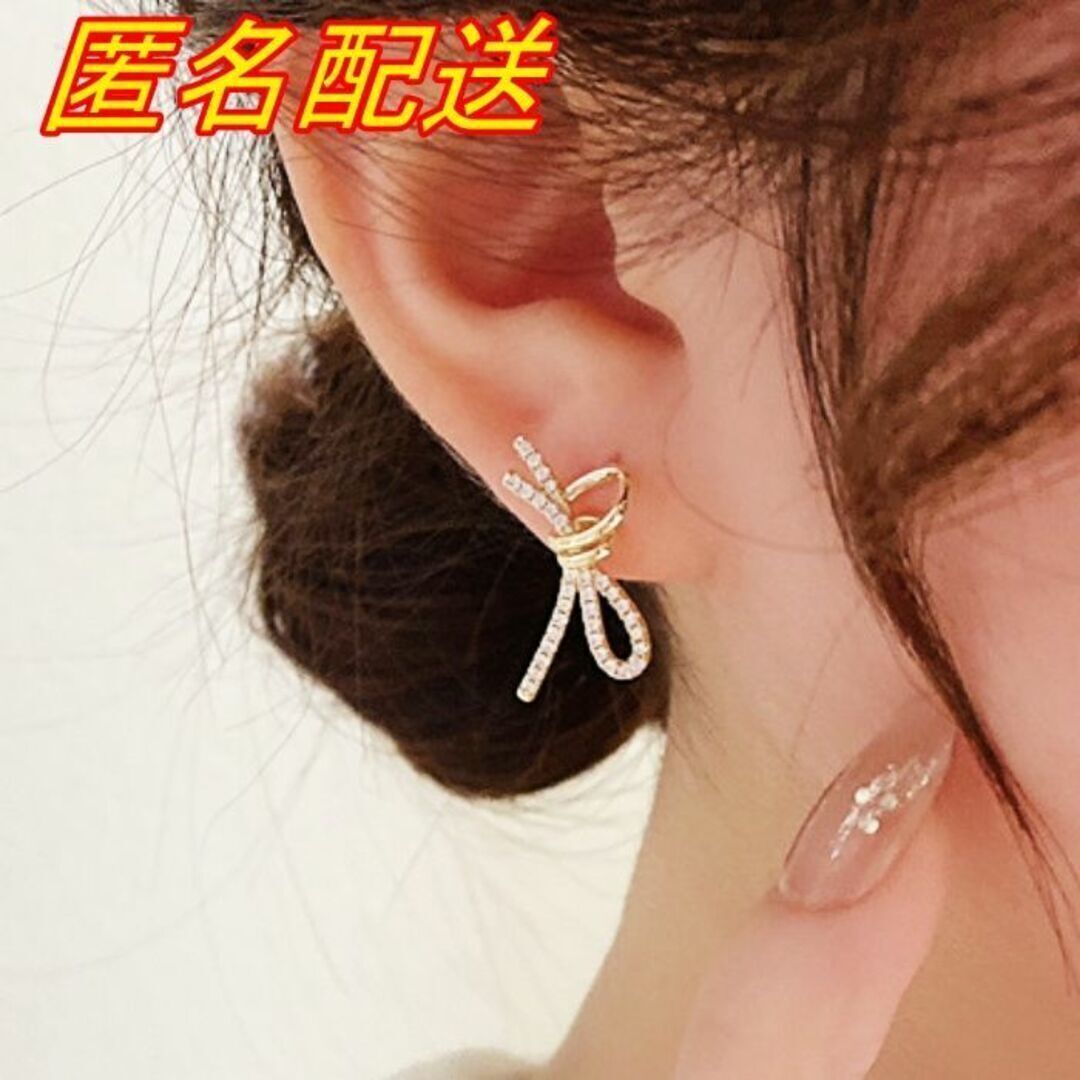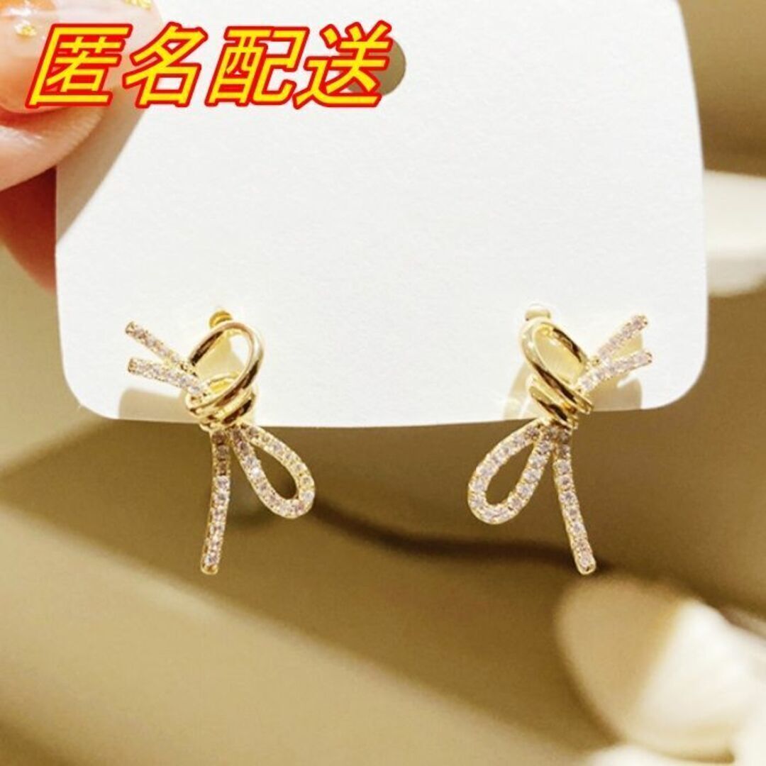 B338 匿名配送 ピアス リボン ジルコニア s925 ゴールド 蝶結び キラキラ スタッドピアス 大きめ 華やか フォーマル 結婚式