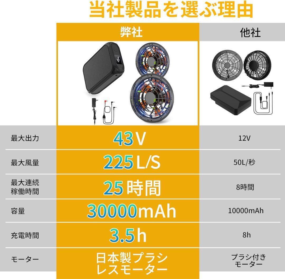 【2025年業界最強43V超高出力ファンバッテリー】2025年最新空調作業服ファンが登場!43V超高出力・30,000mAh超大容量バッテリー・耐久性設計・改良型気流構造を搭載。通常の作業服の上に着用可能なファン付きデザインで、ボタンひとつで瞬時に涼しさを体感。衣類内部に大量の新鮮な空気を高速循環させ、汗を吹き飛ばし湿気を排出。快適なクールダウン効果で集中力向上と身体負担軽減を実現。炎天下の屋内・屋外作業でも長時間の作業持続を可能にし、熱中症対策に最適。225/sの強力な微風を持続的に送風し、効率が衰えない設計です。アウトドアワーカー必携の夏の必需品。