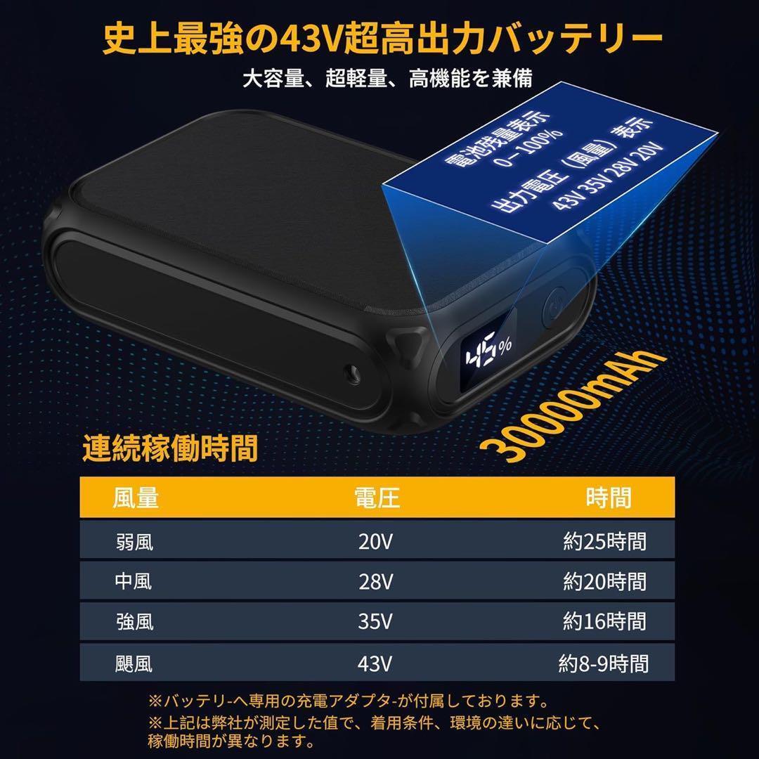 【30000mAh大容量バッテリー&4段階風量調節】本社は最新の成果を採用し、バッテリーの重量が変わらない状況で、バッテリー容量に大幅に向上した。30,000mAh超大容量により極限の長時間稼働を実現。専用急速ACアダプターは約短い時間でバッテリーを100%にすることができます。驚くほどの爆風が、より長時間維持できます。20V-28V-35V-43Vの4段階風量切り替え可能。夏季の広域野外作業における疲労軽減・作業効率向上・熱中症予防に効果的。2025年夏の必須アイテム。※以上のデータは室温25℃の環境下で試験され、バッテリーの使用時間や充電時間にも環境によって誤差があります。