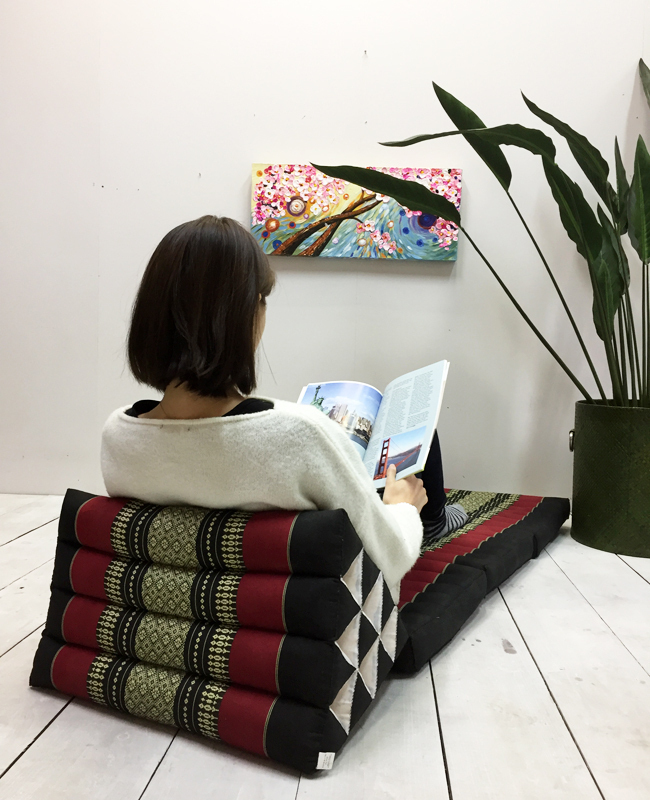 中綿は「カポック」100%でスポンジ材などでは体感できないソフトな硬さです。※カポックとはパンヤ綿のことで、木の実から採取する綿になります。インテリアに、そしてリビングを楽しくするサイドアイテムに!「座椅子」・「ソファ」・「折りたたみベッド」の要素を含んだデザイン性と機能性を備えたアジアンリゾートインテリアを代表する三角枕です。