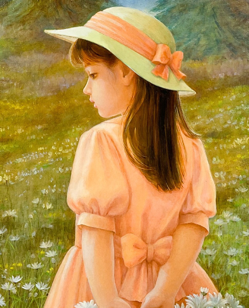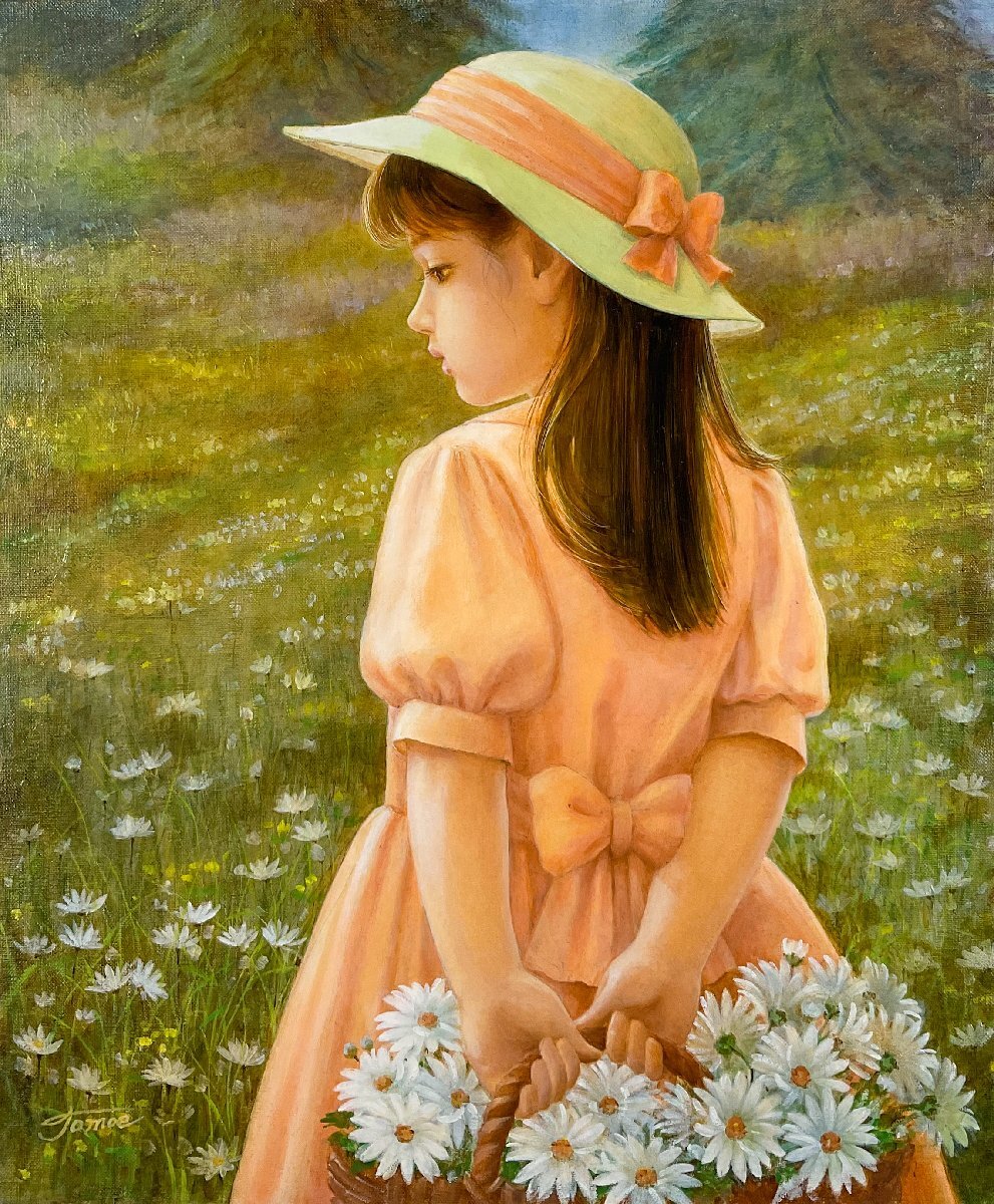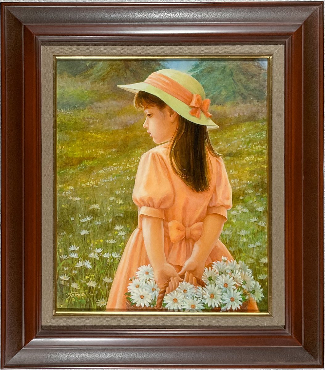 清水朋江(1939-)●油彩8号美少女画『花摘む少女』●一枚の絵取扱細密画家●岩手県●武蔵野美術大学