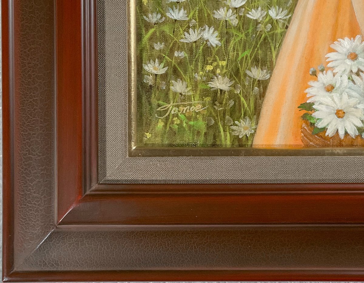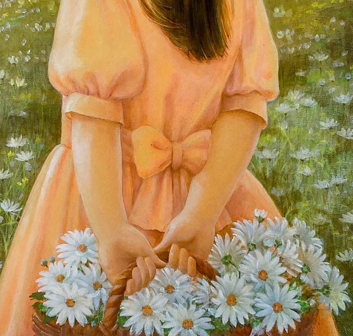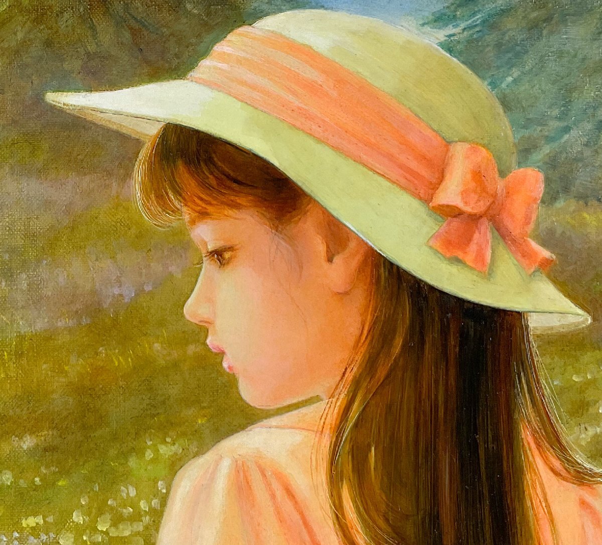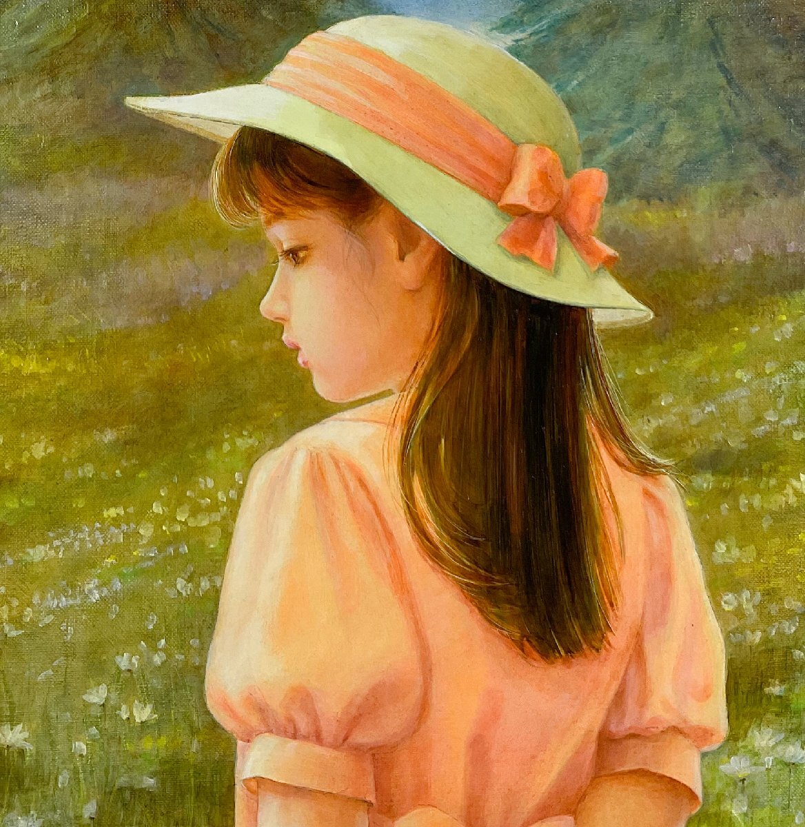 清水朋江(1939-)●油彩8号美少女画『花摘む少女』●一枚の絵取扱細密画家●岩手県●武蔵野美術大学