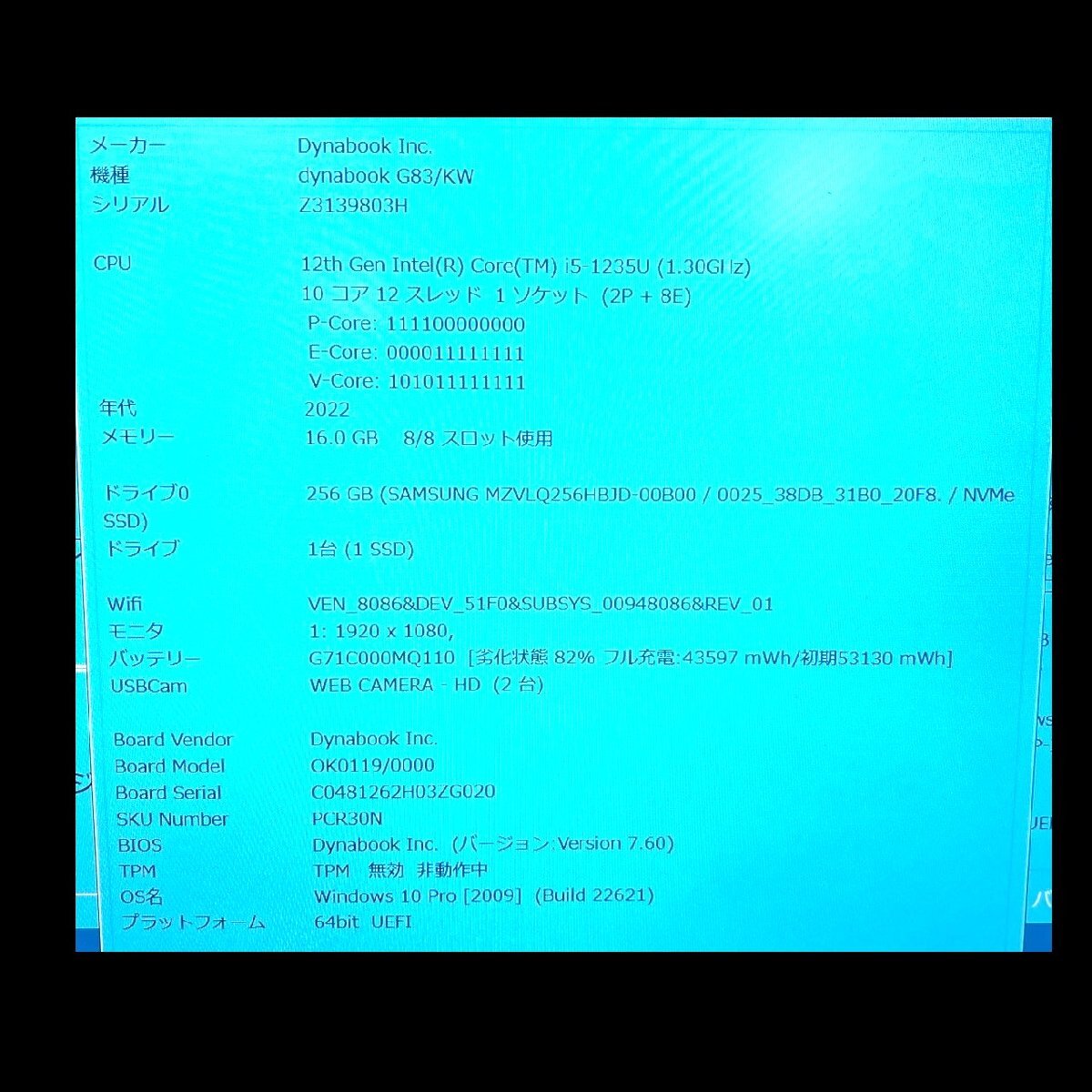 難あり Dynabook G83/KW Core i5-1235U メモリ16GB SSD256GB Webカメラ 無線LAN 13.3インチ S2507-103