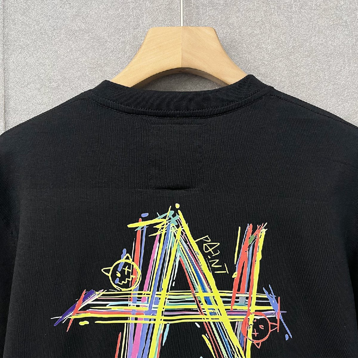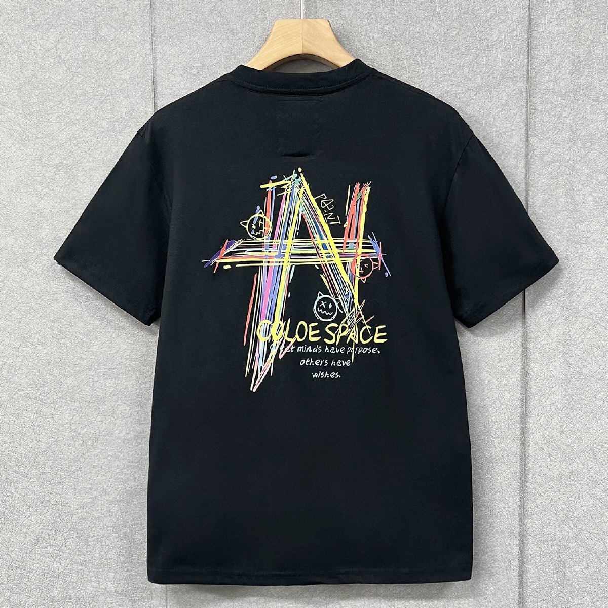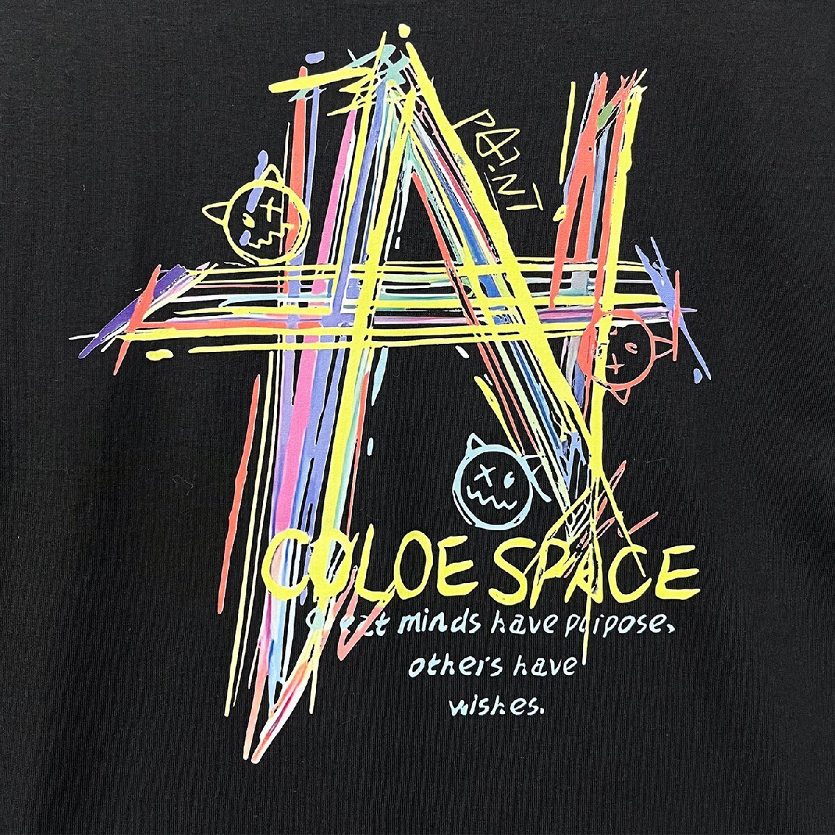 シンプルな丸首のデザイン、着脱しやすいし、ゆったりとした快適なTシャツ。カラーは定番のブラックとなり、胸元にもバックにも手描き風の英字柄をデザインし、カラフルで注目度抜群!!着ればスタイリッシュなイメージに仕上げられており、ストリートな着こなしが楽しめます。