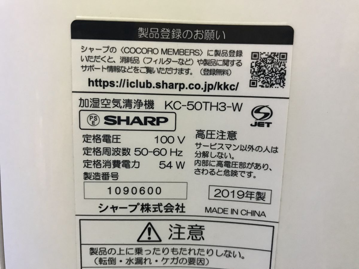 1【 シャープ / SHARP 】加湿空気清浄機【 KC-50TH3-W 】2019年製 空調 プラズマクラスター 140/600