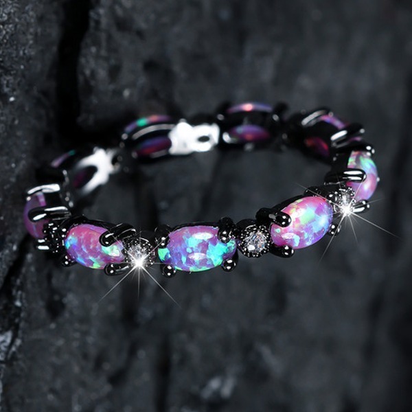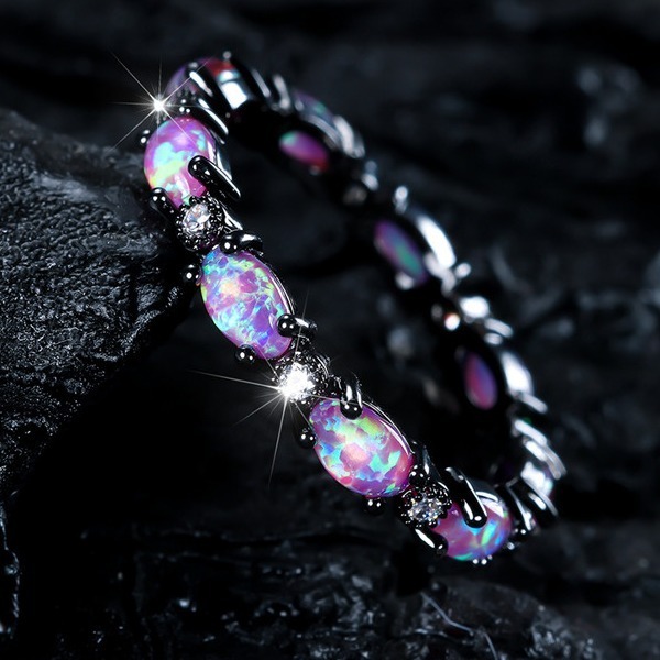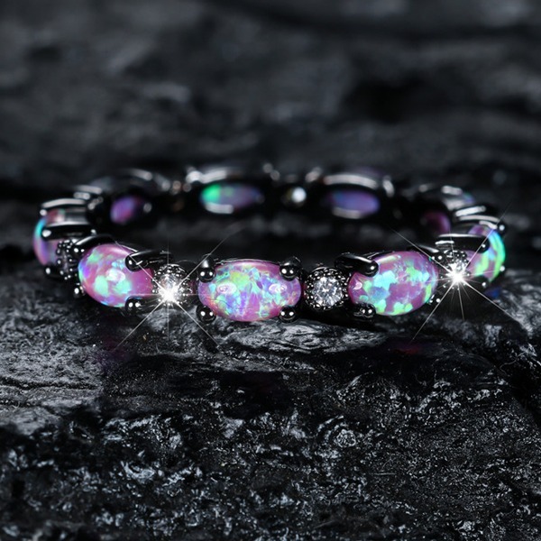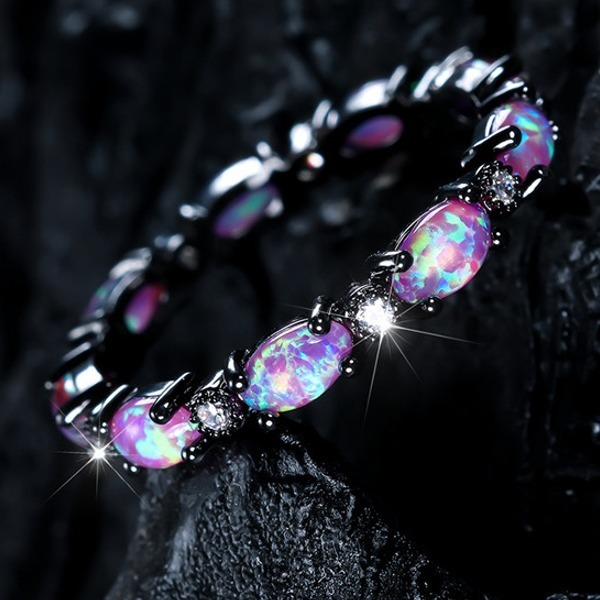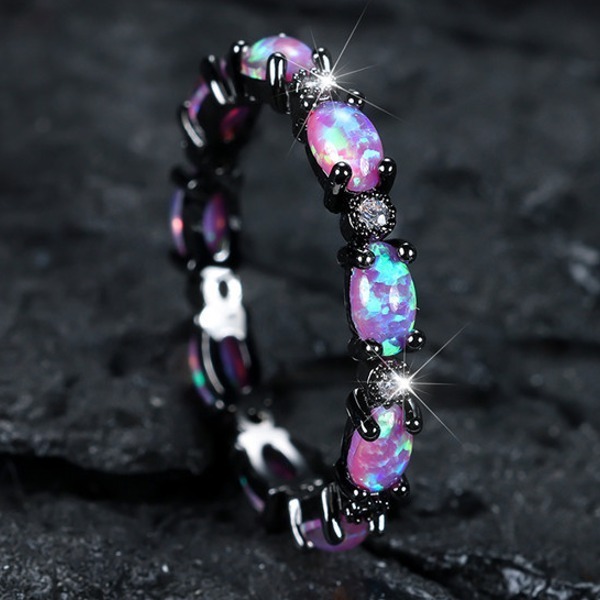 パープルファイアオパール婚約指輪、かわいい小さなオーバルストーン結婚指輪、女性のためのヴィンテージブラックメタルバンドジュエリー、ブライダルアクセサリー