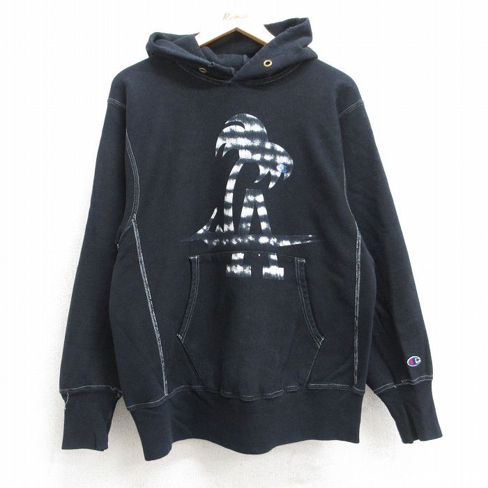 【商品名】 L★古着 長袖 チャンピオン Champion リバースウィーブ パーカー メンズ ワンポイントロゴ ヤシの木 魚 黒
