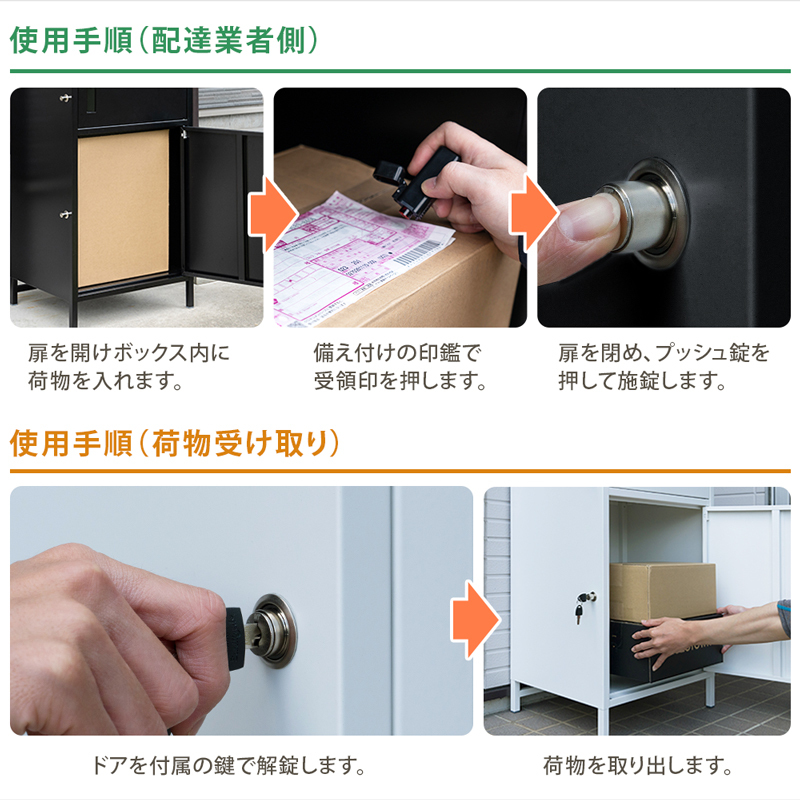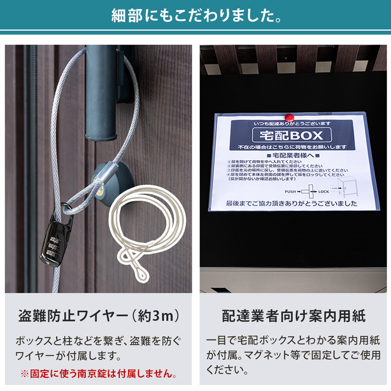 | 商品説明 | 組立品(40分)※工具付属 丈夫で安心のスチール製!不在時でも安心して荷物が受け取れる宅配ボックス2ドアタイプ。 専用の鍵と盗難防止ワイヤーが付属し、留守中も配達物をしっかり守ります。 ! ネット通販などの配達物を不在時でも受け取れる、大容量2ドアタイプの宅配ボックス。 2段のスペースは配達物ごとに使い分けられ、個別に施錠もできて便利です。 本体は丈夫なスチール製。柱などに繋げる盗難防止ワイヤーも付属します。 内部には印鑑収納スペース。配達業者向けの案内用紙も付属し使いやすい仕様になっています。 ●購入特典として本体を覆うビニールカバー付!雨天の際も安心です。 |