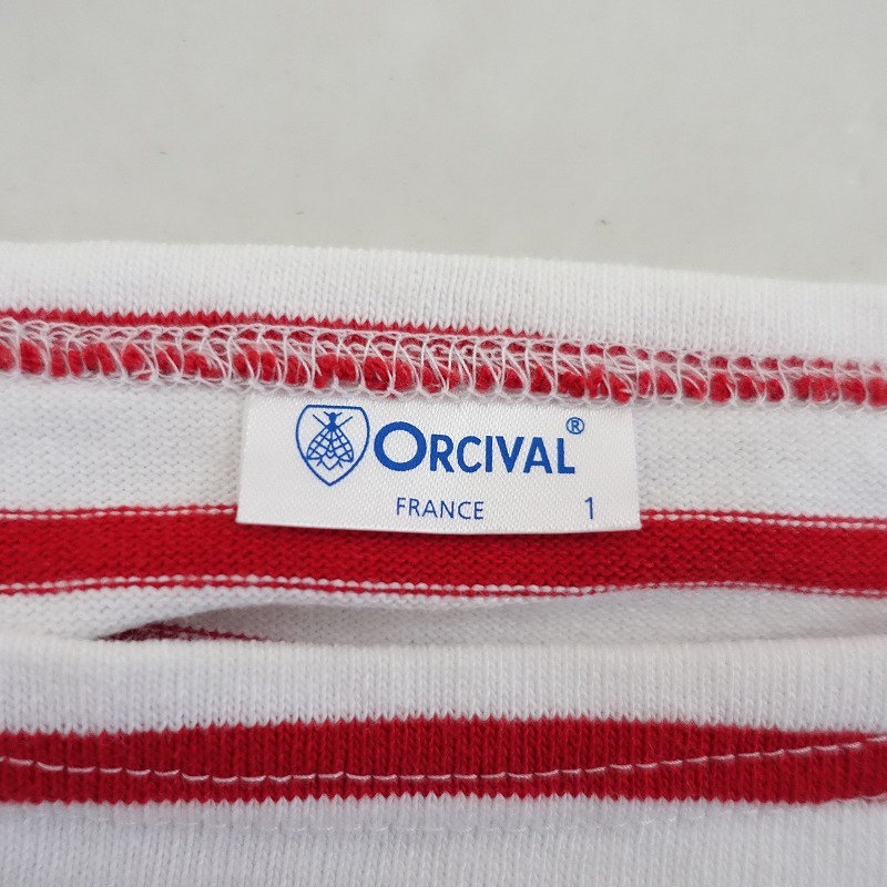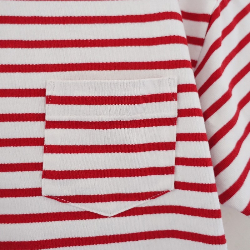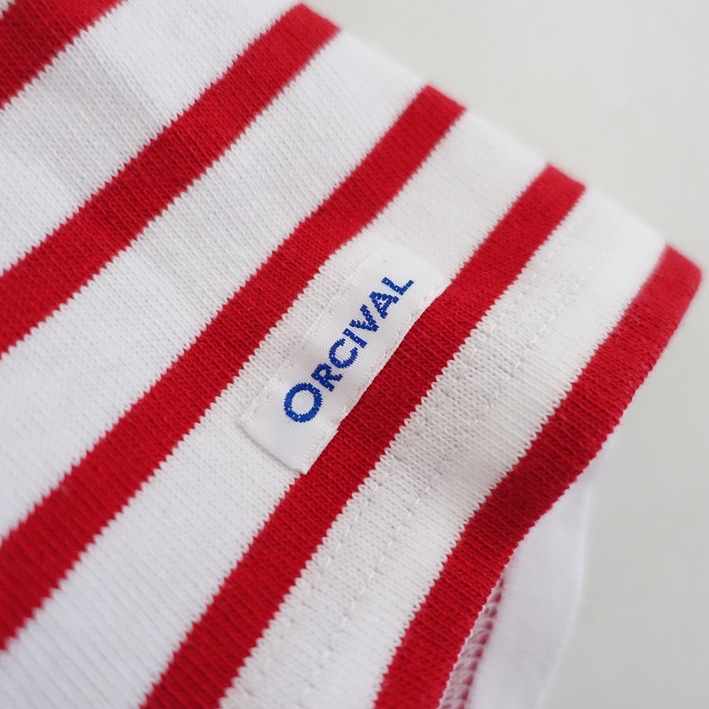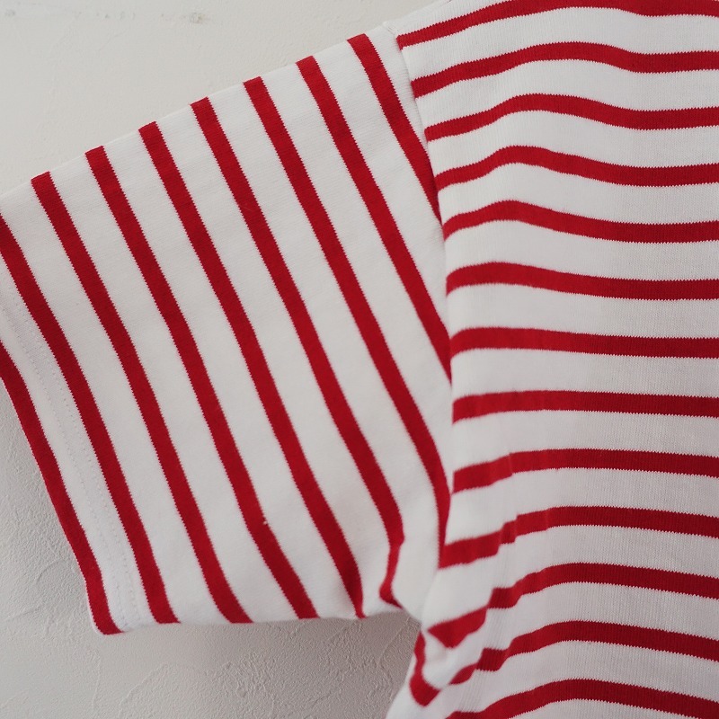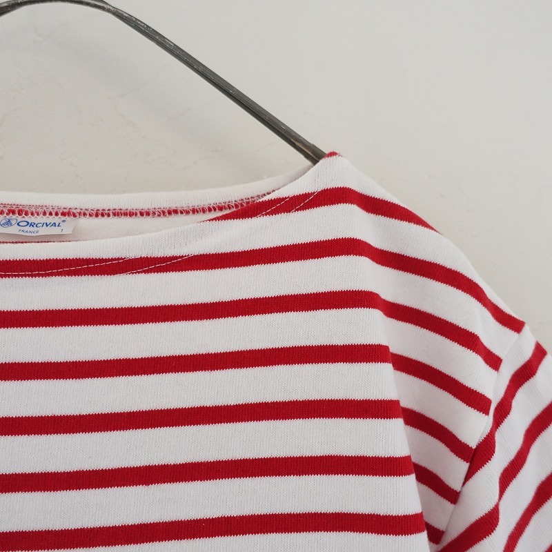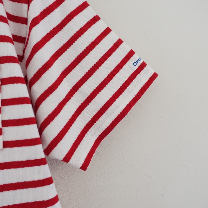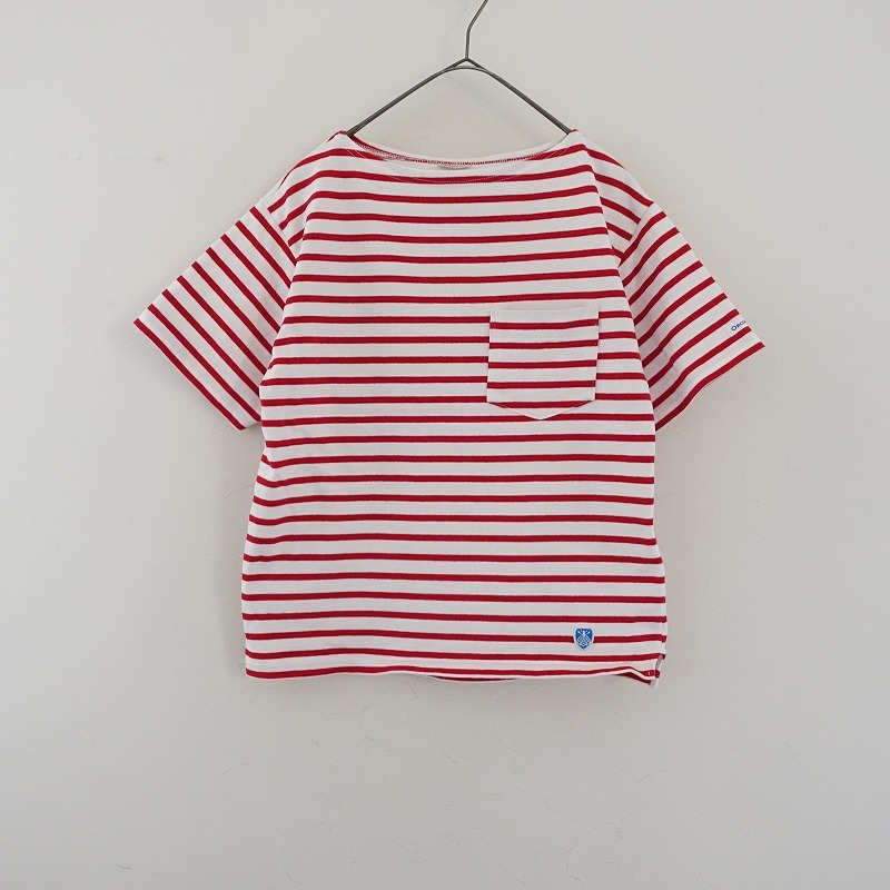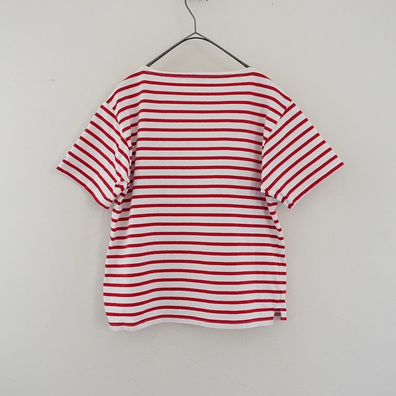 ORCIVALのコットンボーダーボートネック半袖カットソーです。カラーはレッド×ホワイトで、ボーダー織地で仕立てられております。ポケットが1つ、左袖にネームタグ、左裾にワッペンがあしらわれております。 |