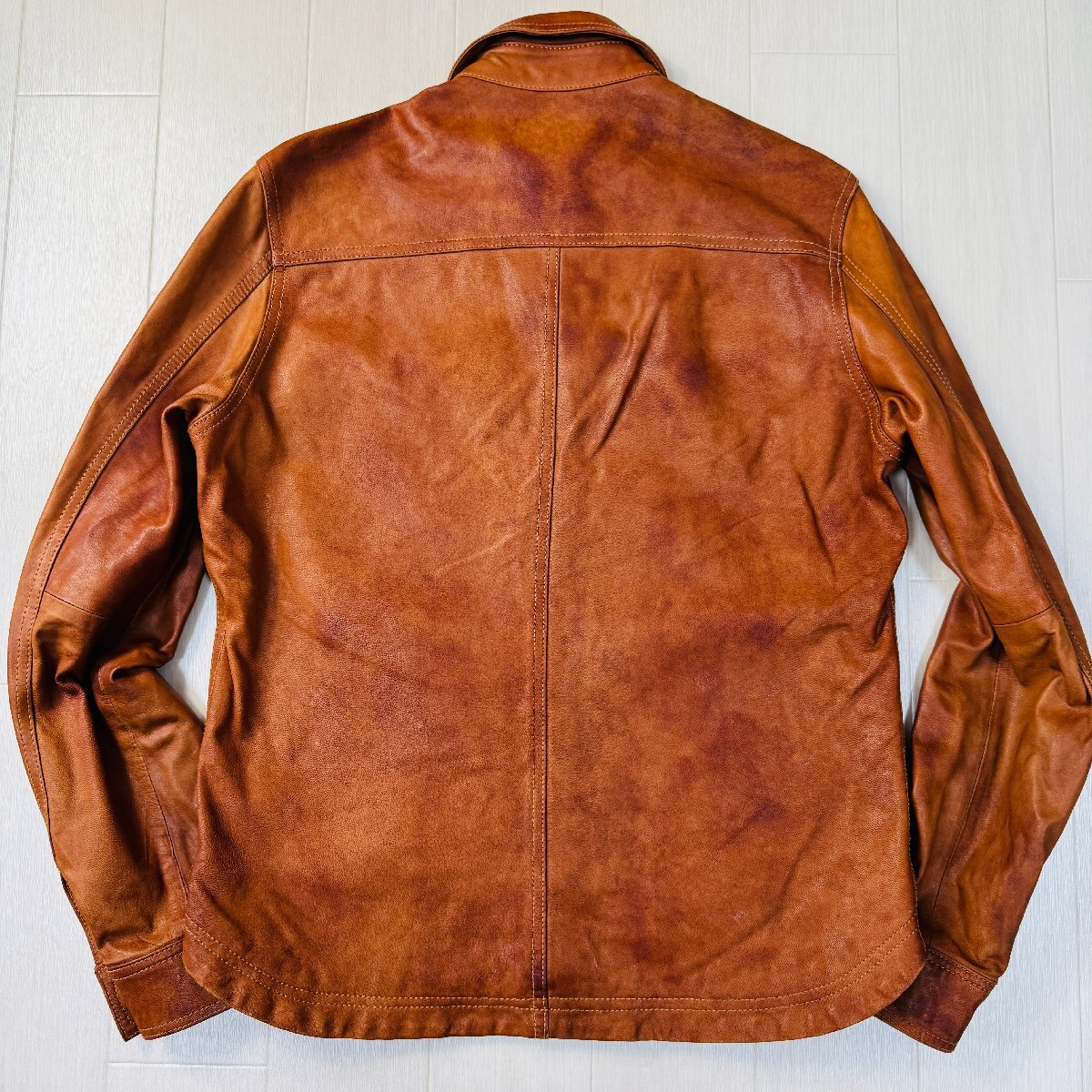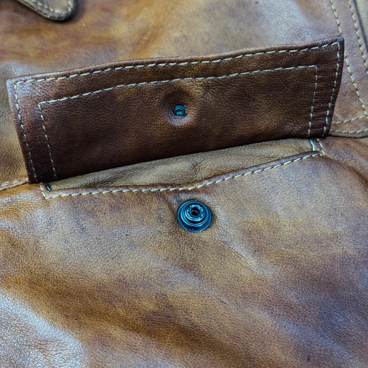 革製品独特の色むら小傷スレ、裏地に色移り、胸ポケットのボタンが破損していますが、まだまだご着用いただける状態のお品物となっています。
