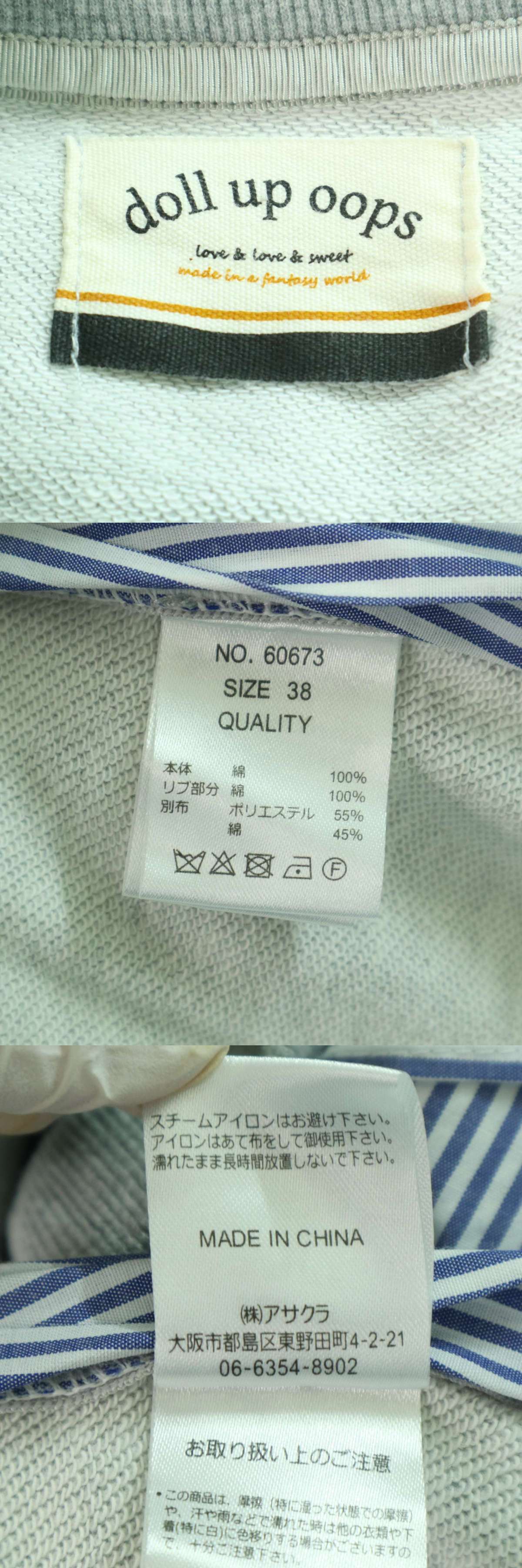 doll up oops ドールアップウップス スウェット★ 異素材切替 アシンメトリー トレーナー プルオーバー Sz.38 レディース 灰