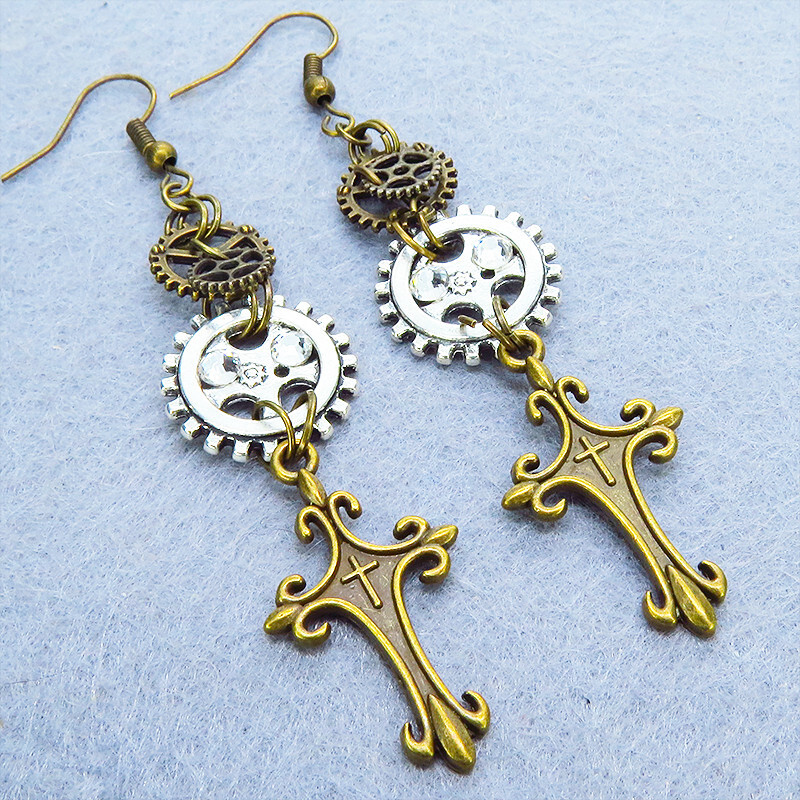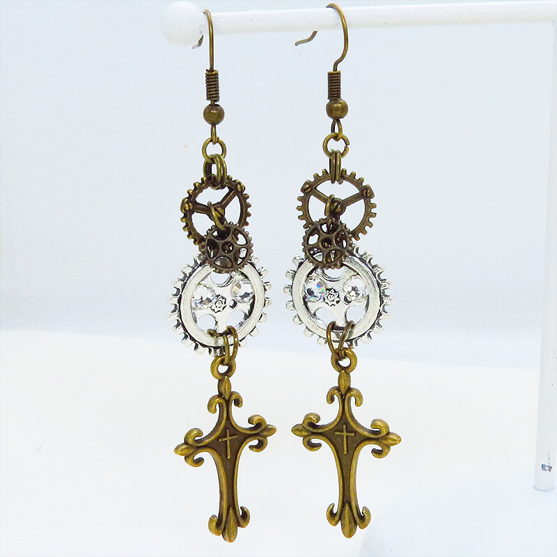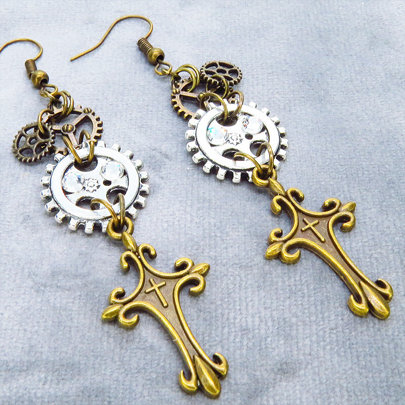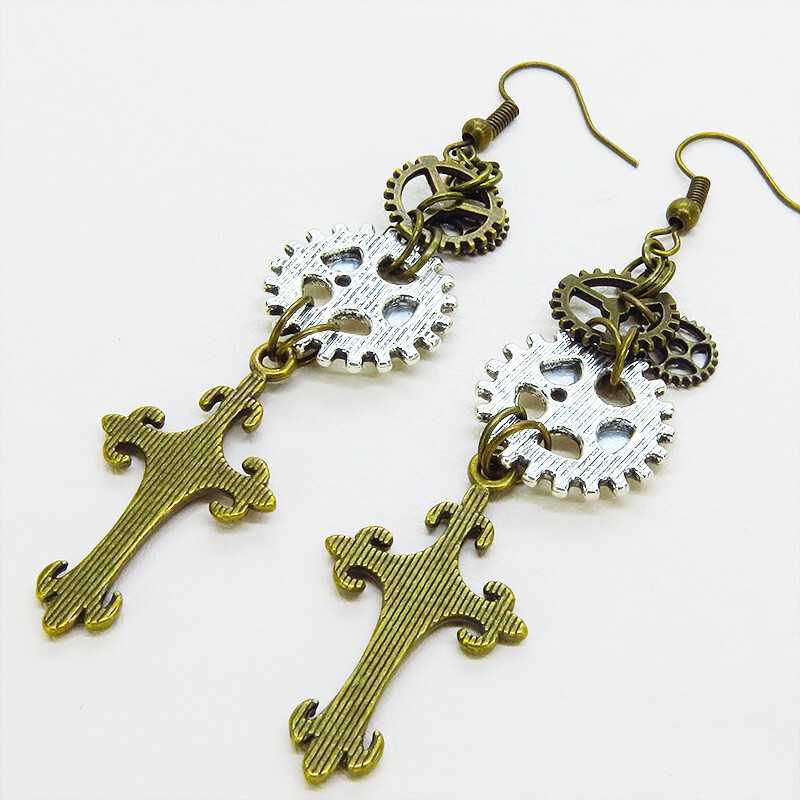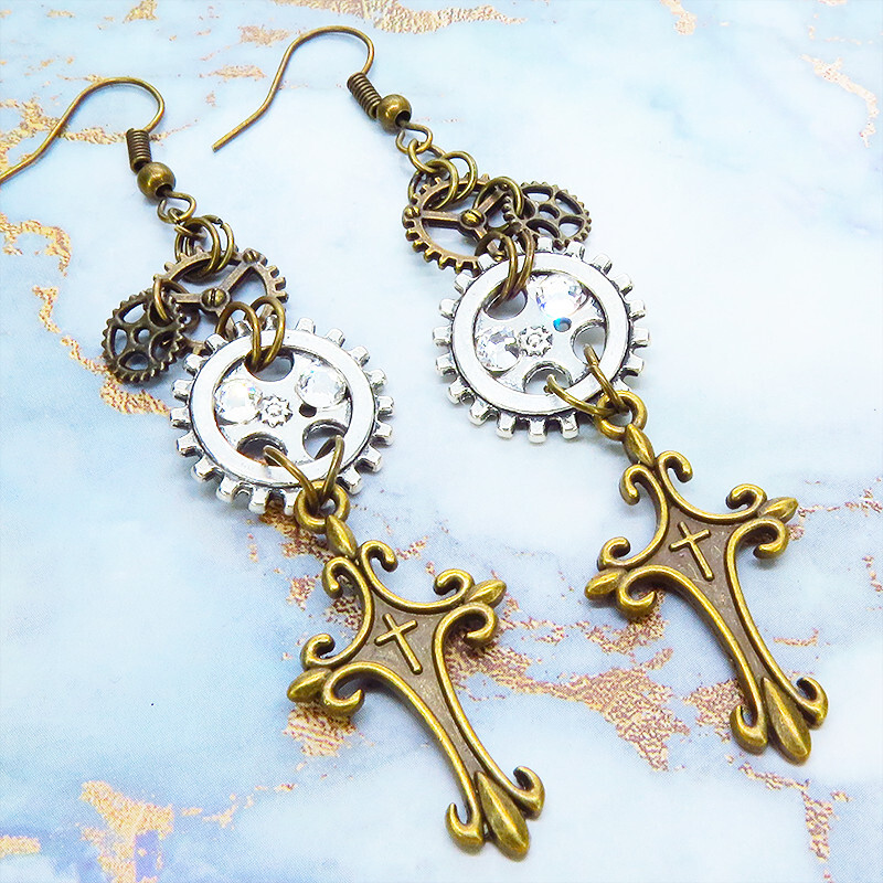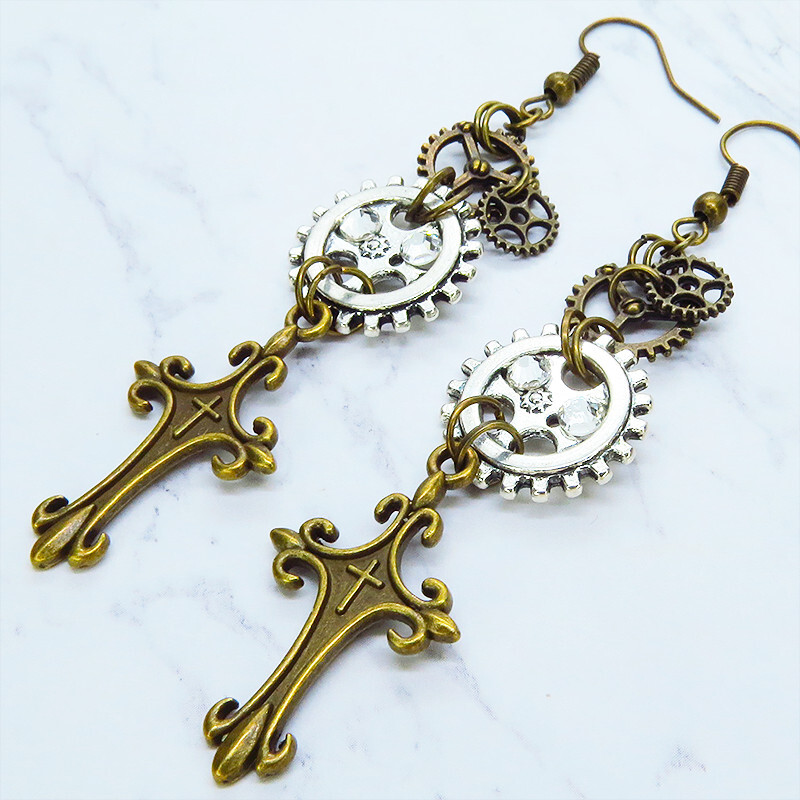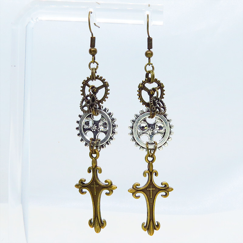 アンティークゴールド ロザリオと歯車を組合せたスリムなスチームパンクピアス アンティークシルバー
